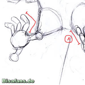 Denkt euch wieder an Ho-Oh’s Hals entlang eine imaginäre Linie, nur diesmal vorne am Köper bis zum Bauch - ihr könnt diese auch leicht einzeichnen. Die Linie ist für euch eine gute Orientierung für das Hals- und Bauchgefieder - es soll ja schön mittig sein! ^^ Ihr könnt nun die einzelnen Krallen direkt miteinander verbinden (siehe Bild) und die überstehenden Kreisreste wegradieren.