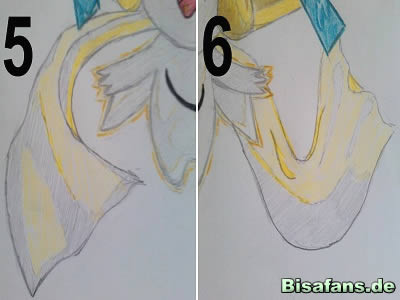 - Schattenzonen skizziert ihr leicht mit Bleistift und malt danach mit Gelb darüber. Auf das Gelb kommt sozusagen "Schatten im Schatten". Also nehmt einen goldenen und einen orangenen Holzstift und zeichnet auf das Gelb in der Schattenzone.