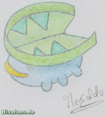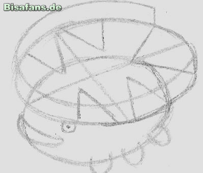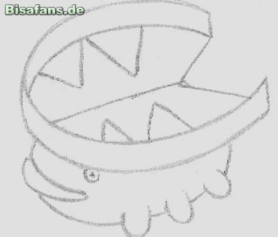 Man fügt dem Blatt als Nächstes den nach oben gefalteten Blattrand hinzu und kann mit dem Körper anfangen. Im Grunde besteht er nur aus so etwas wie einem Schnabel, einem Auge und drei kleinen Beinchen, falls man es so gezeichnet hat wie ich. Hat man das Pokémon eher von vorne gezeichnet, muss man abwägen, ob man beide Augen oder mehr Beine zeichnet. Man sollte mit dem Schnabel anfangen, der, wie im Bild zu sehen, nur aus zwei Bögen besteht. Etwas über den Enden des Schnabels kommen die Augen hin (oder auch nur eins): zwei kleine Kreise mit jeweils einem Punkt in der Mitte. Danach die Beine: Loturzel hat insgesamt sechs Beine, also auf jeder Seite drei. Eigentlich sind das nur kleine Stummelchen und bedürfen keiner weiteren Erklärung.