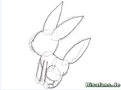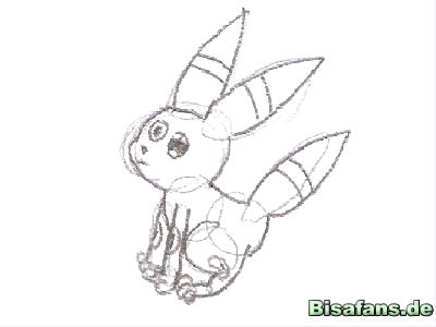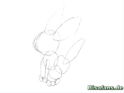 Zeichnet als erstes die Grundformen. Ein Kreis für den Kopf und den Körper, auch für die Pfoten und lange Vierecke für die Beine.