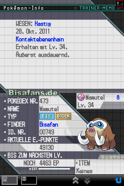 Nach der Eingabe des Passworts folgt ein kleines Suchspiel, bevor Mamutel auf den DreamWorld Account übertragen wird. Mit der nächsten Spielsynchro wird Mamutel dann auf den Spielstand von Pokémon Schwarz/Weiß übertragen und kann in der Kontaktebene abgeholt werden. Falls man auch bei der Traumeiche ein Pokémon erhalten haben sollte und beide mit einem Traumball fangen will, sollte man nach dem Fangen des ersten Pokémon in der Kontaktebene diese verlassen und erneut betreten. Dann bekommt man erneut einen Traumball ;)