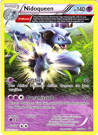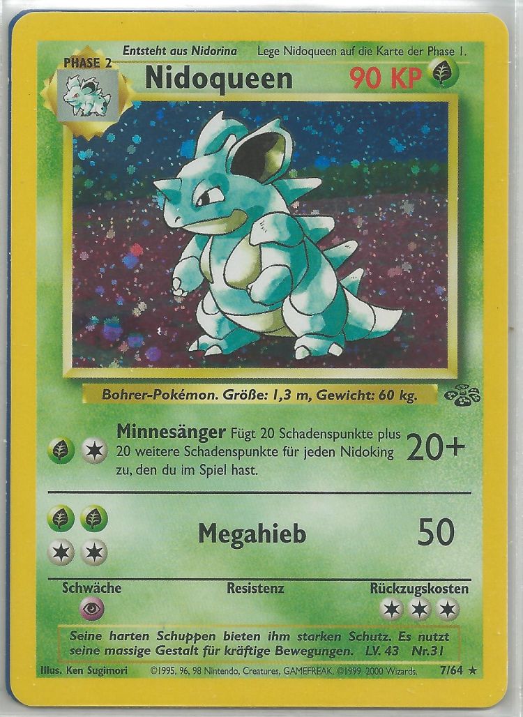 - AS Nidoqueens Körper ist mit sehr harten Schuppen bedeckt. Es ist sehr geschickt darin, Gegner mit harten Attacken wegzuschleudern. Dieses Pokémon entwickelt die größte Kraft, wenn es seine Jungen verteidigt.