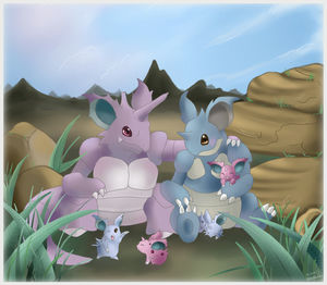 - In "Pokémon: Mewtu kehrt zurück" taucht ein Baby Nidoqueen auf, obwohl sich Nidoqueen in den Spielen nicht fortpflanzen können und neugeborene Pokémon sonst nur als die jeweils erste Entwicklungsstufe ihrer Spezies schlüpfen.
