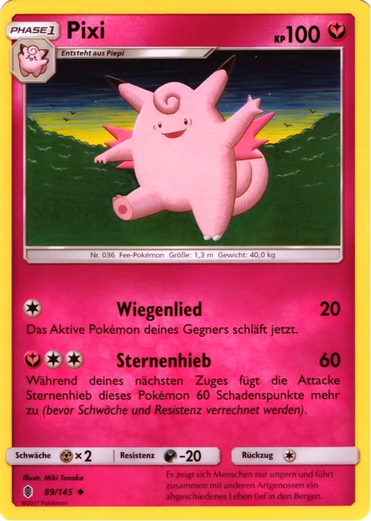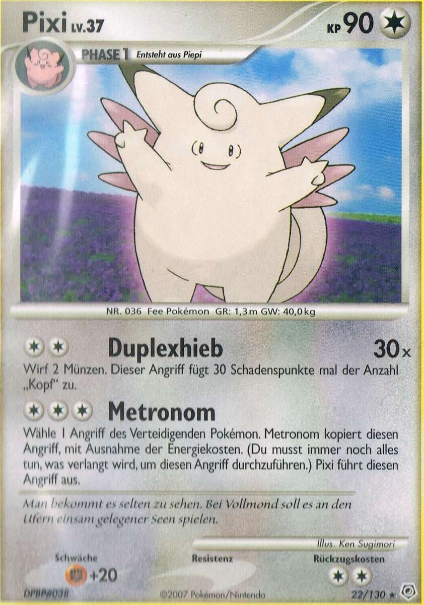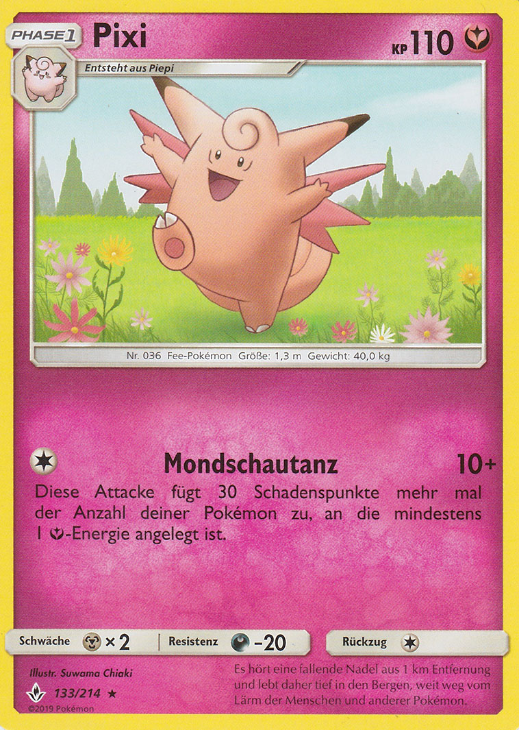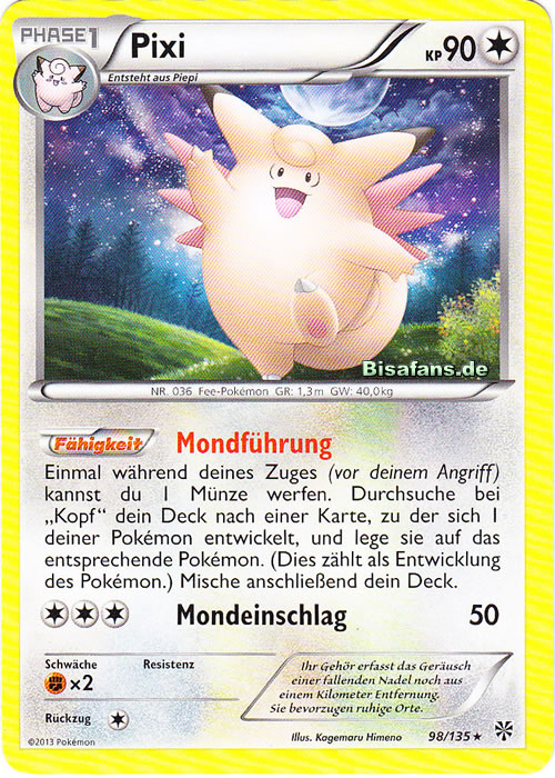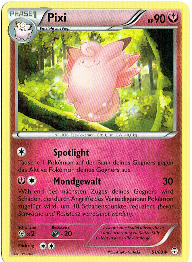 Gedankengut-Pixi hat zwar in der siebten Generation starke Konkurrenz von den Kapus um den Feen-Slot im Team bekommen, ist aber dennoch nach wie vor ein guter Lategame-Sweeper. Nach ein paar Gedankengut-Boosts ist es oft nur noch durch sehr starke oder sehr effektive physische Attacken zu bezwingen, allerdings ist es langlebiger als die meisten Anwender solcher Attacken. Diese Langlebigkeit wird durch Weichei gewährleistet, während Mondgewalt den sehr soliden STAB darstellt. Flammenwurf trifft Stahlpokémon wie Durengard, Tentantel, Mega-Scherox und Kaguron effektiv, während Donnerwelle generell eine sehr nützliche Attacke ist, auch wenn insbesondere Kapu-Kimes Nebelfeld die Effektivität der Attacke einschränkt. Weitere Optionen wie Abschlag zum Entfernen der Items lästiger Gegner wie Chaneira oder Zugabe als Tech gegen gegnerischen Setup sind auch denkbar, ebenso wie Tarnsteine, wobei sich besonders in diesem Fall ein Trapper wie Magnezone anbietet, der die Stahlpokémon aus dem Weg räumt, gegen die Pixi so gar nichts mehr ausrichten kann. Mit 12 Initiative-EVs überholt man Durengard ohne Investment und kann vor seinem Angriff noch ein weiteres Mal boosten, die restlichen EVs gehen in die KP und physische Defensive, da die spezielle Seite sowieso durch Gedankengut gestärkt wird.