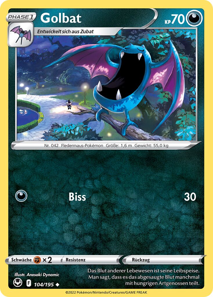 - S Golbat beißt seine Beute mit seinen vier Reißzähnen und trinkt das Blut seiner Opfer. Es wird in Nächten aktiv, in denen nicht einmal der Mond scheint. Es fliegt dann durch die Dunkelheit und greift Menschen und Pokémon an.