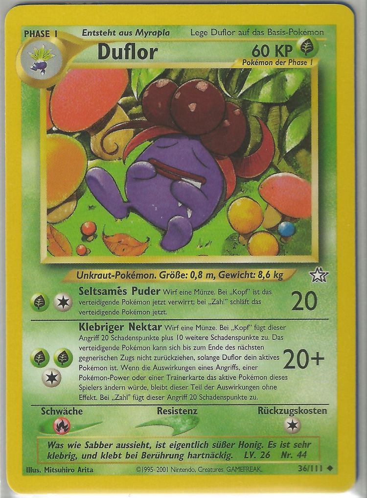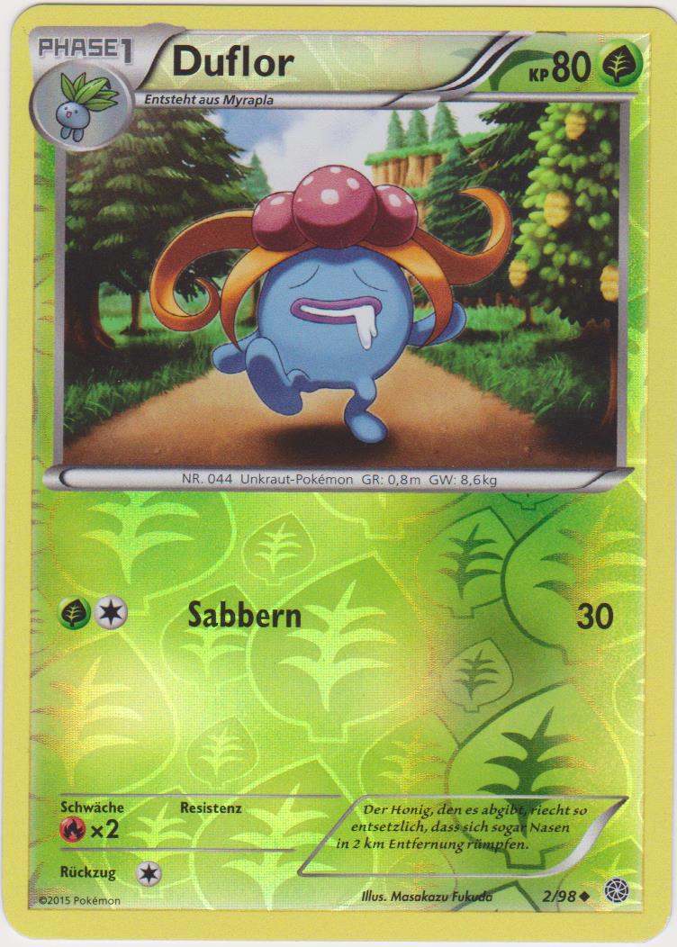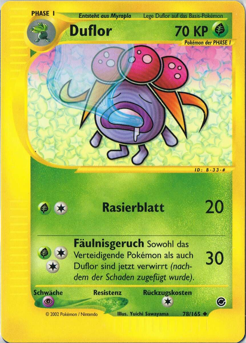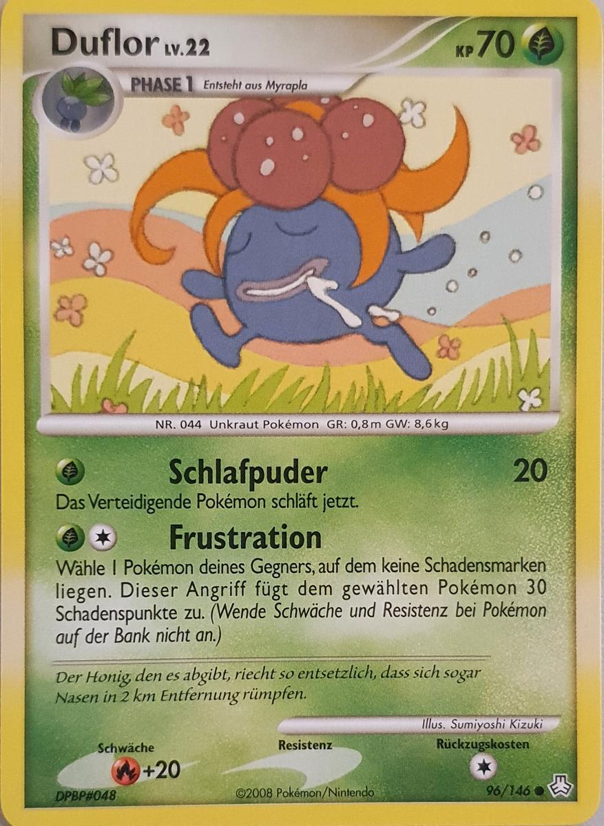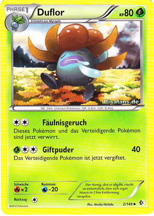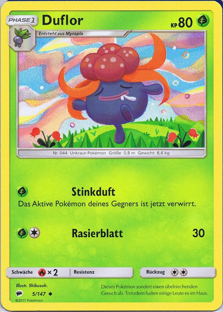 - OR Duflor produziert einen ekelerregenden Gestank aus dem Stempel seiner Blume. Wenn es in Gefahr gerät, wird der Gestank noch unerträglicher. Wenn sich dieses Pokémon in Sicherheit befindet, stößt es keinen Gestank aus.