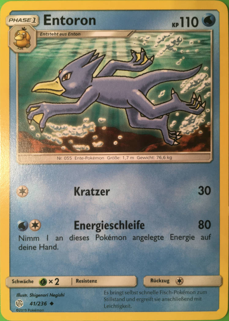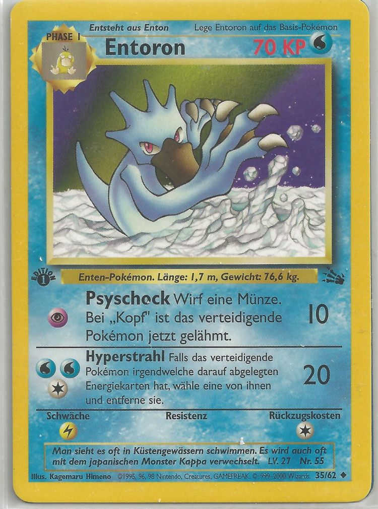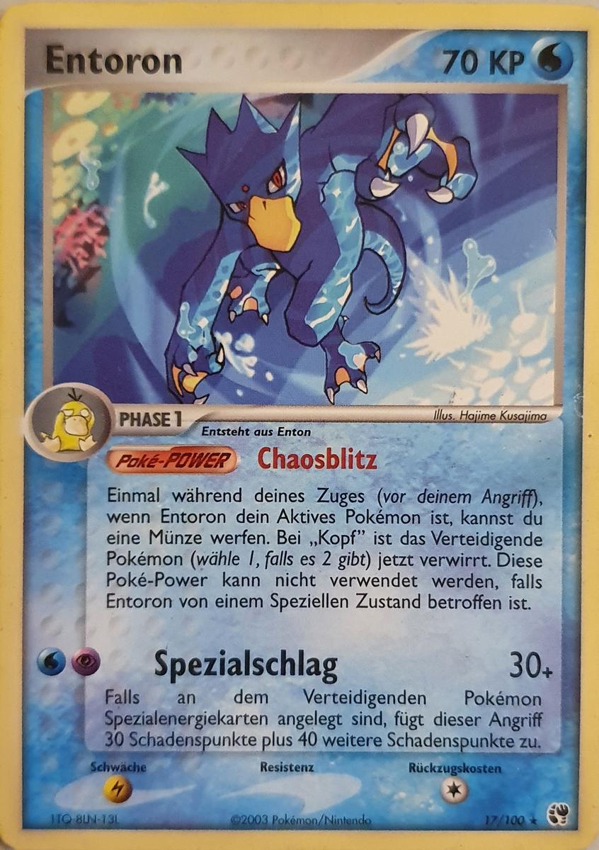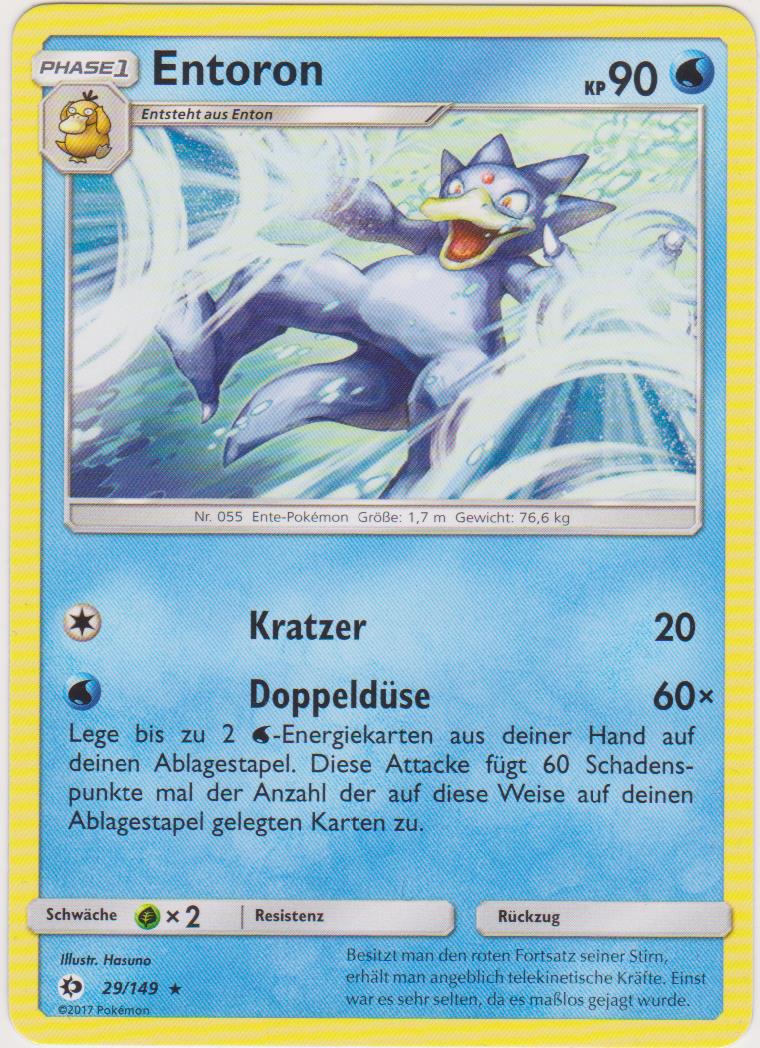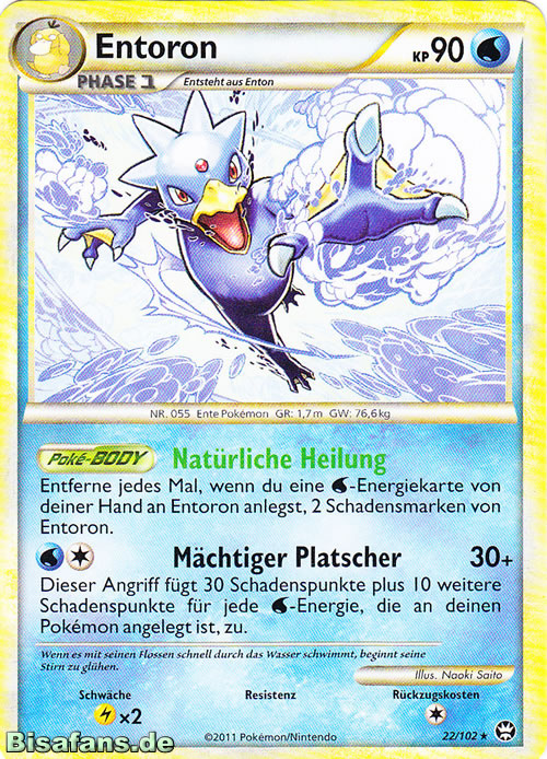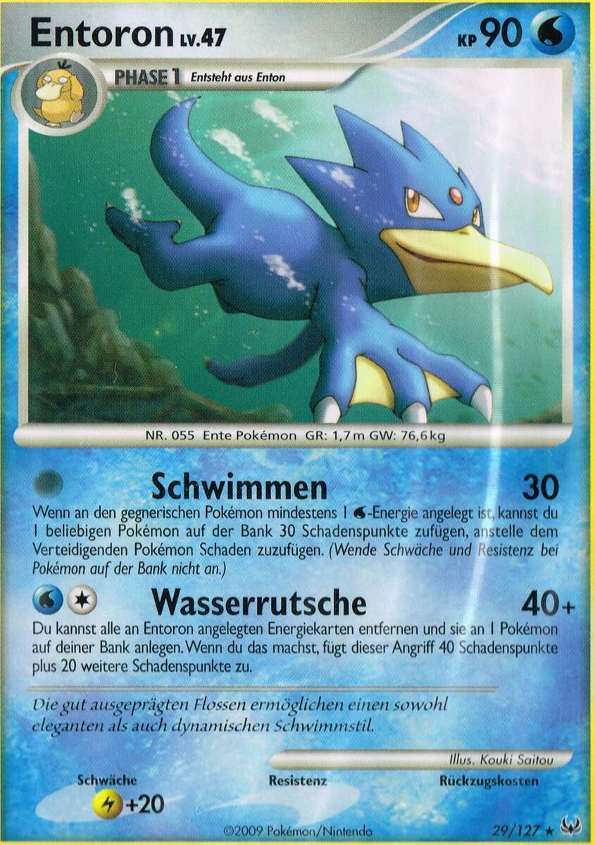 - AS Entoron ist der schnellste Schwimmer von allen Pokémon. Es schwimmt mit Leichtigkeit auch durch eine raue, stürmische See. Manchmal rettet es Menschen, die in Seenot geraten sind und auf dem Meer treiben.