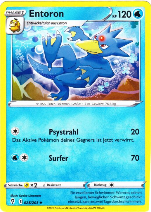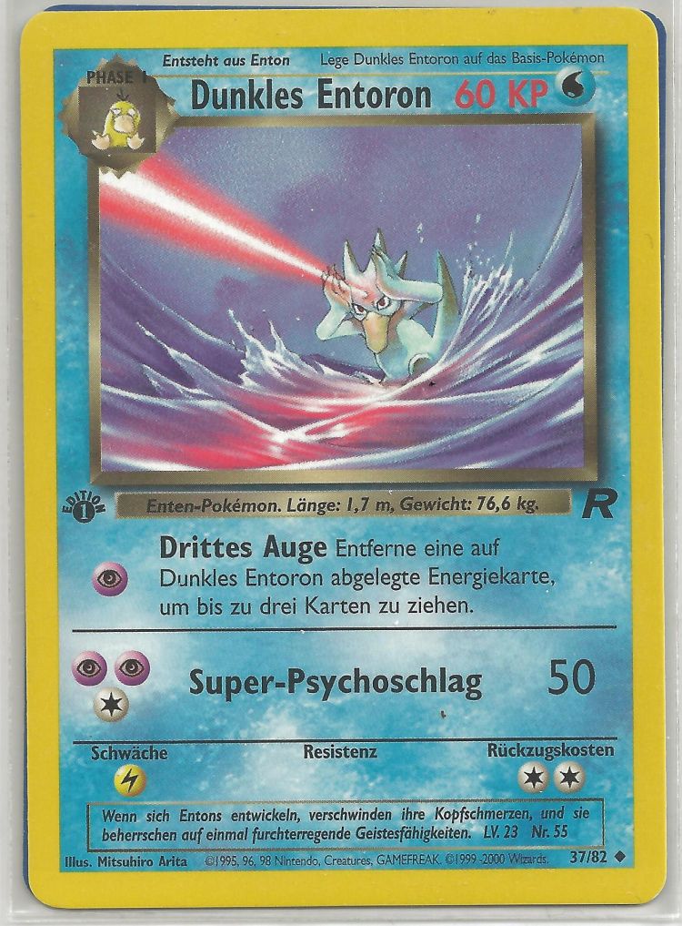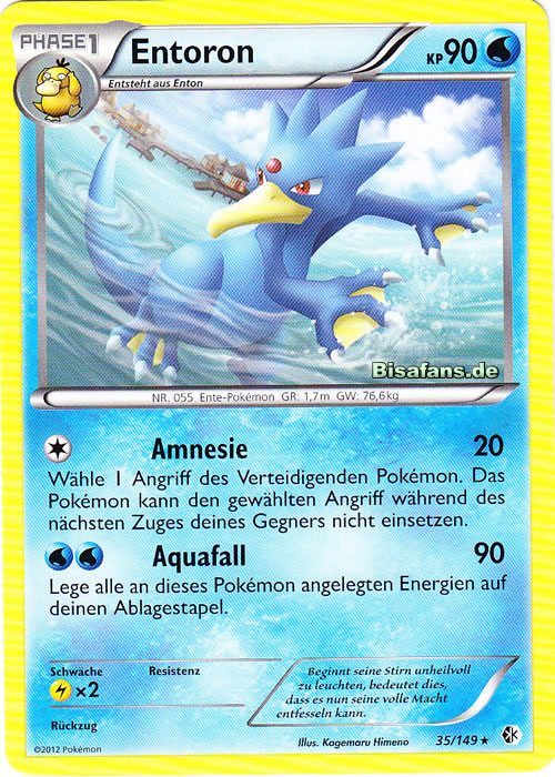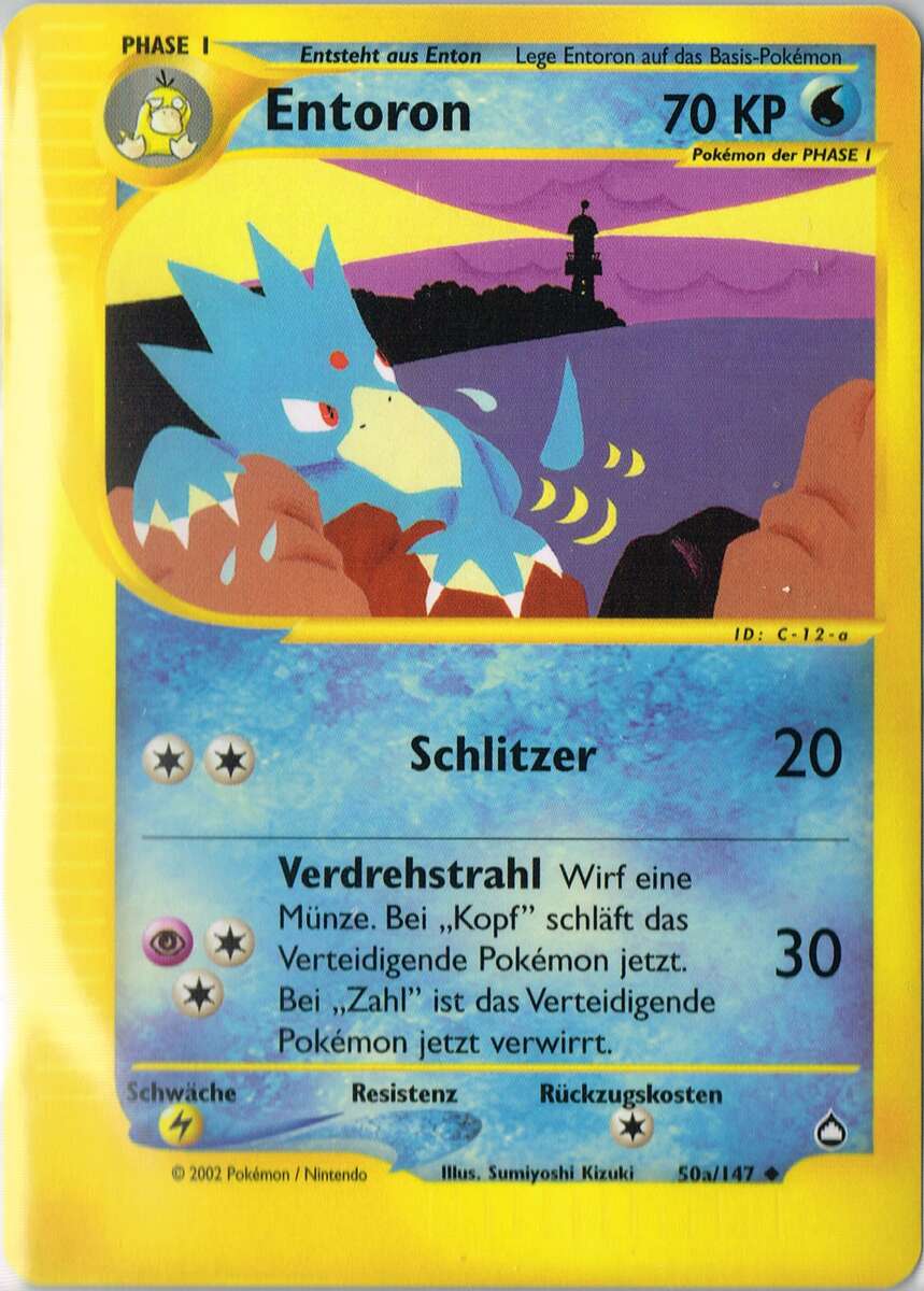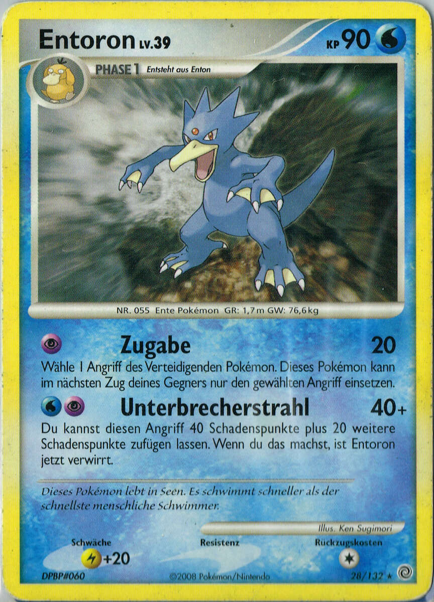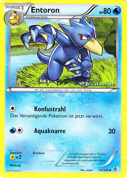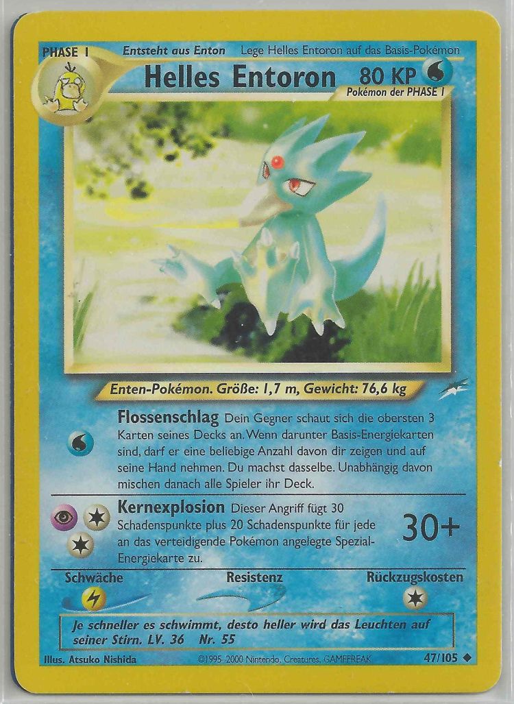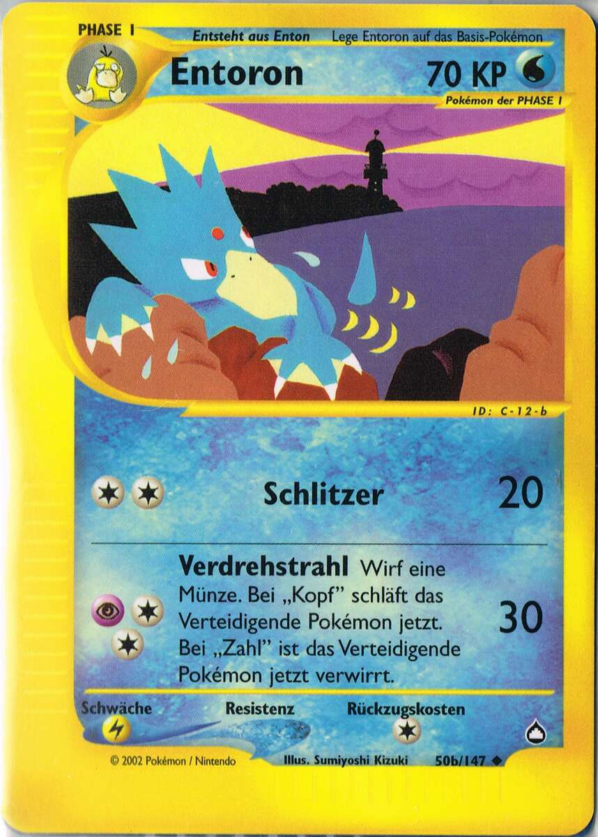 - AS Entoron ist der schnellste Schwimmer von allen Pokémon. Es schwimmt mit Leichtigkeit auch durch eine raue, stürmische See. Manchmal rettet es Menschen, die in Seenot geraten sind und auf dem Meer treiben.
