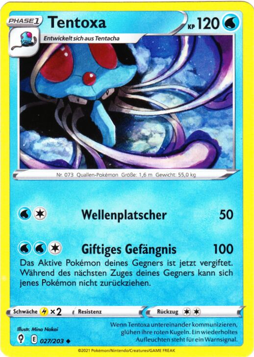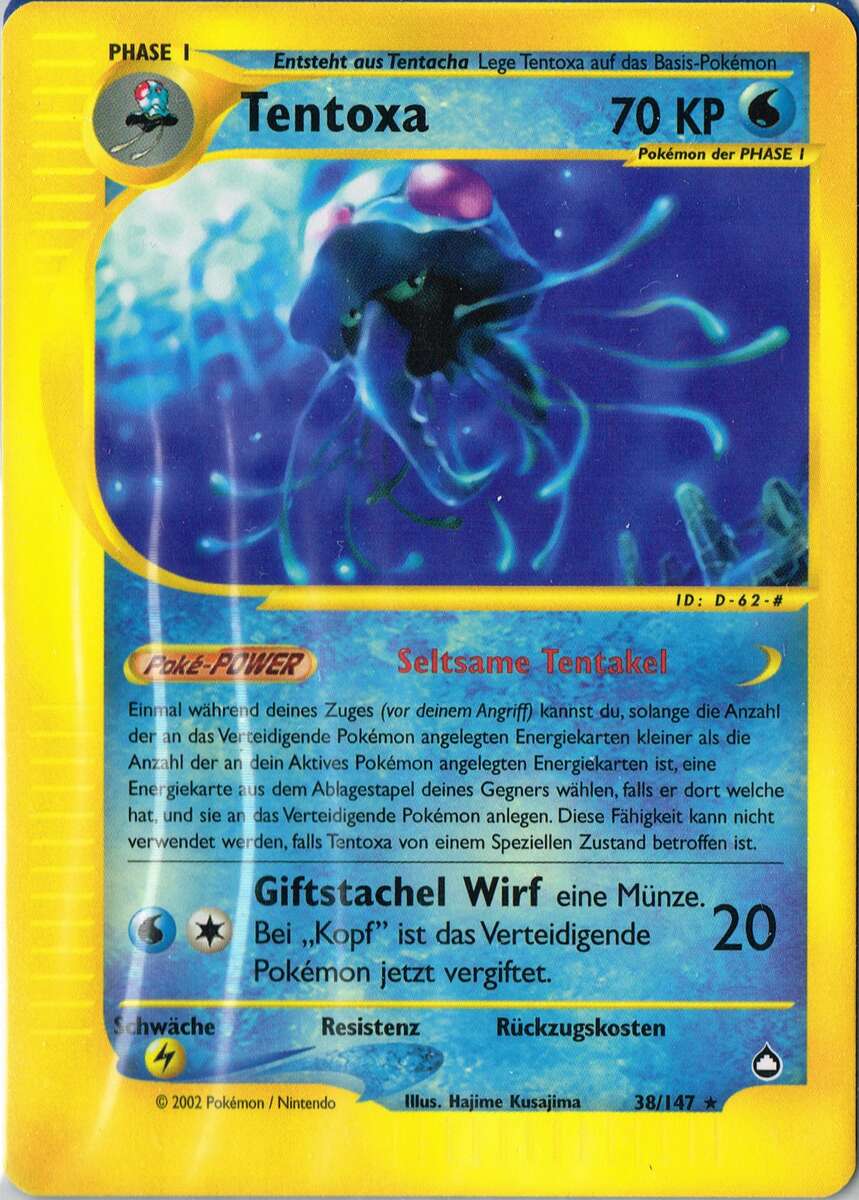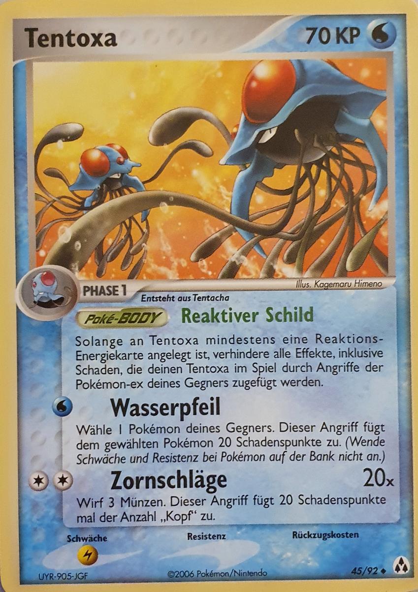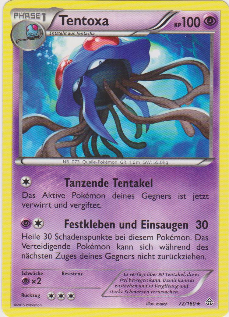 - OR Tentoxa hat große, rote Kugeln auf seinem Kopf. Sie glühen auf, bevor sie seine Gegner mit Ultraschall erschüttern. Ein Ausbruch dieses Pokémon erzeugt starke Wellen in seiner Umgebung.