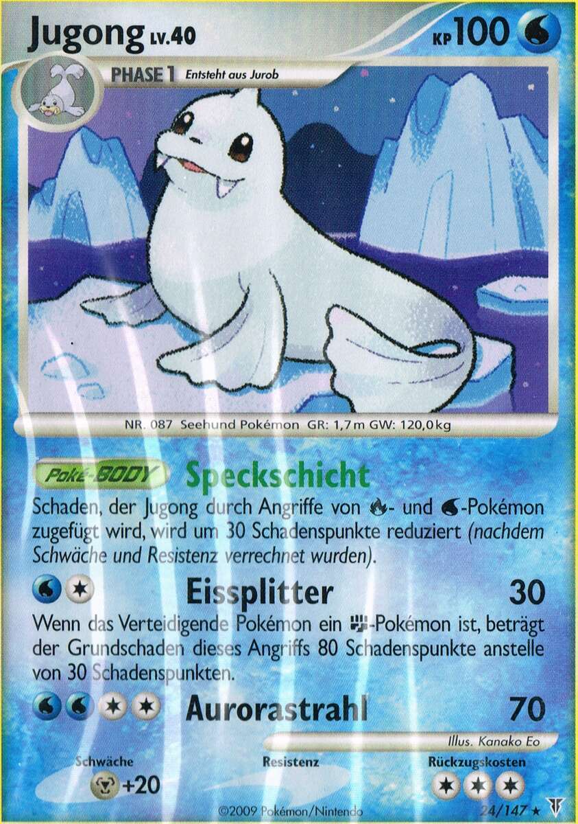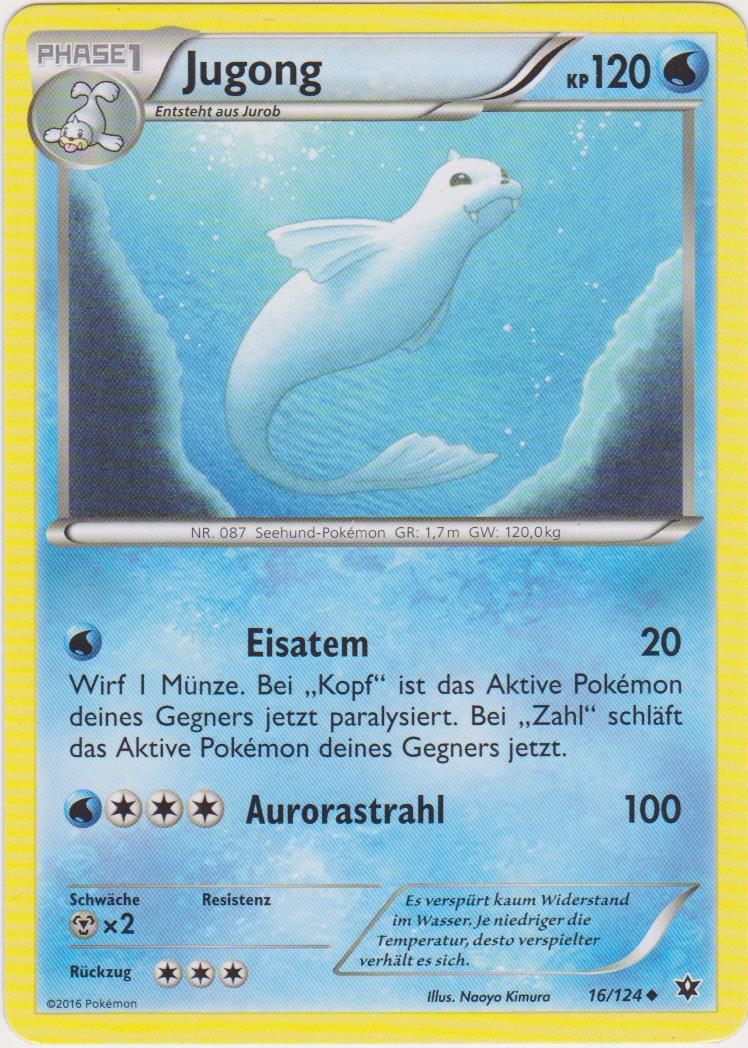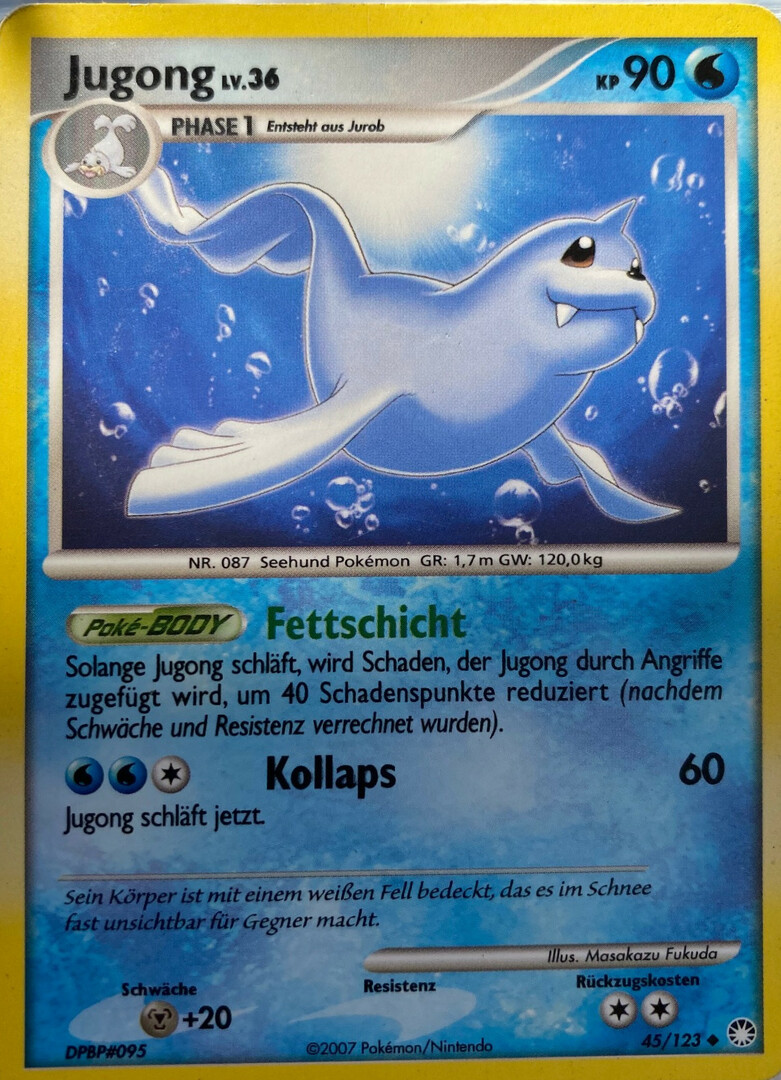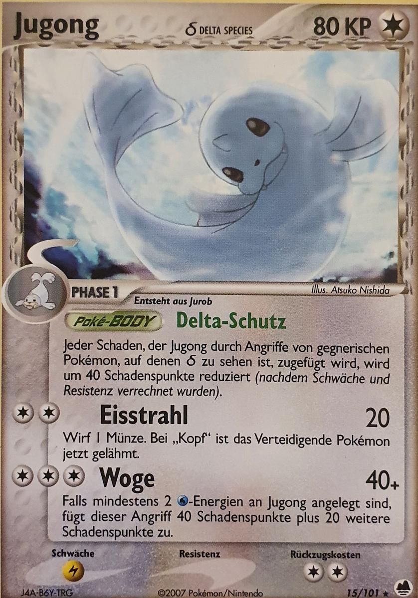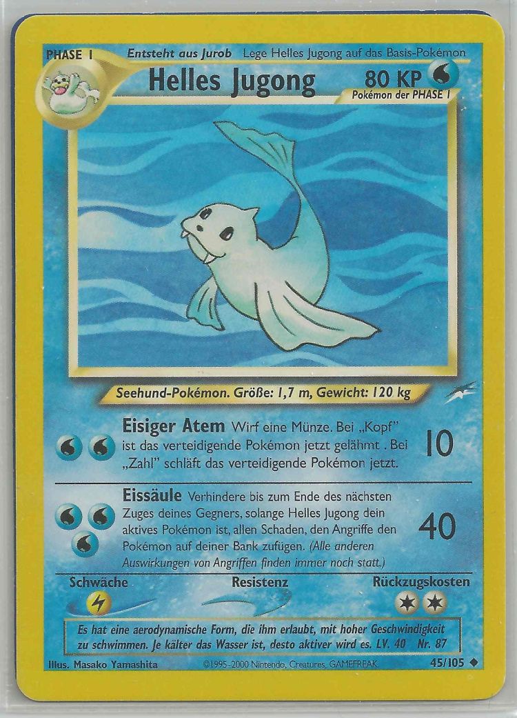 - OR Jugong liebt es, auf bitterkalten Eisschollen ein Nickerchen zu machen. Ein Seemann, der einmal ein solches Pokémon schlafend auf einem Eisberg sah, hielt es irrtümlicherweise für eine Meerjungfrau.