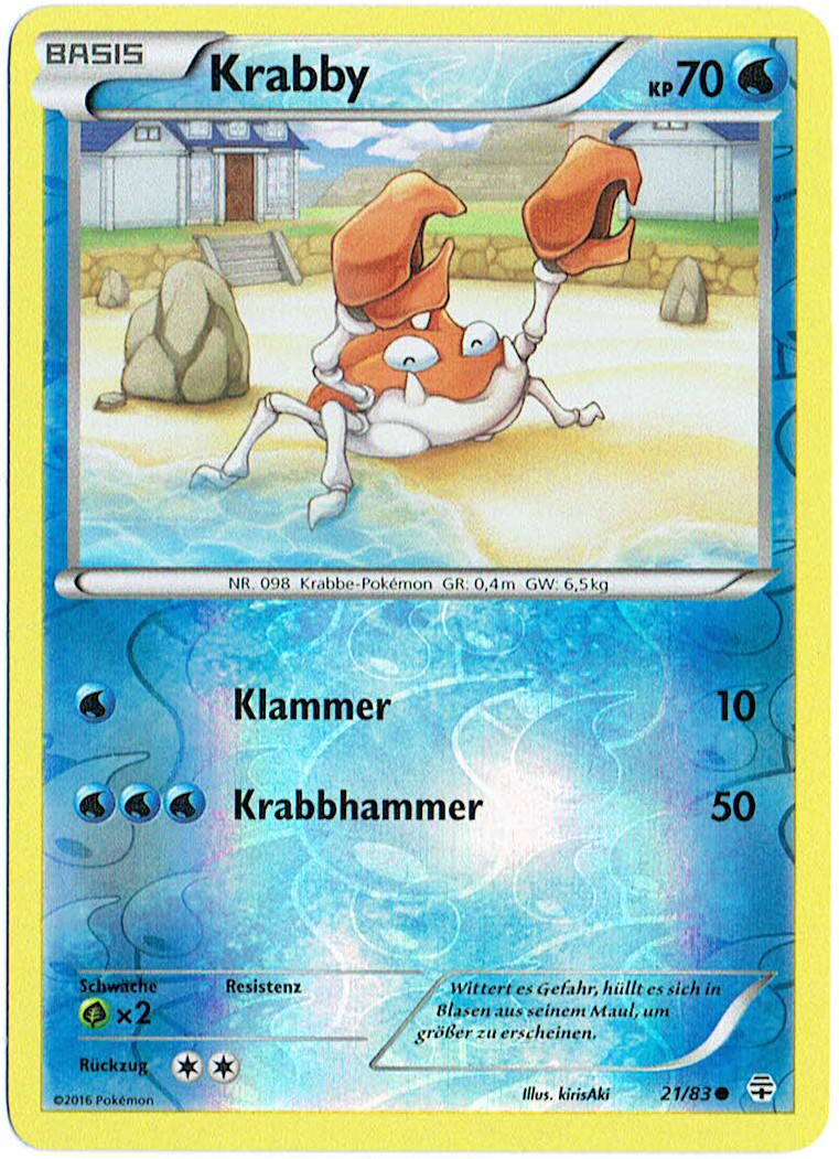 - OR Krabby lebt an Stränden, in Löchern im Sand. An Sandstränden, an denen es wenig Nahrung findet, sieht man dieses Pokémon mit Artgenossen um sein Revier streiten.