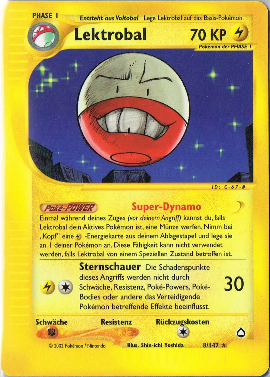 - S Typisch für LEKTROBAL ist seine große Faszination für Elektrizität. Es ist ein problematisches POKéMON, das sich meistens in Kraftwerken niederlässt, wo es sich von frisch erzeugtem Strom ernähren kann.