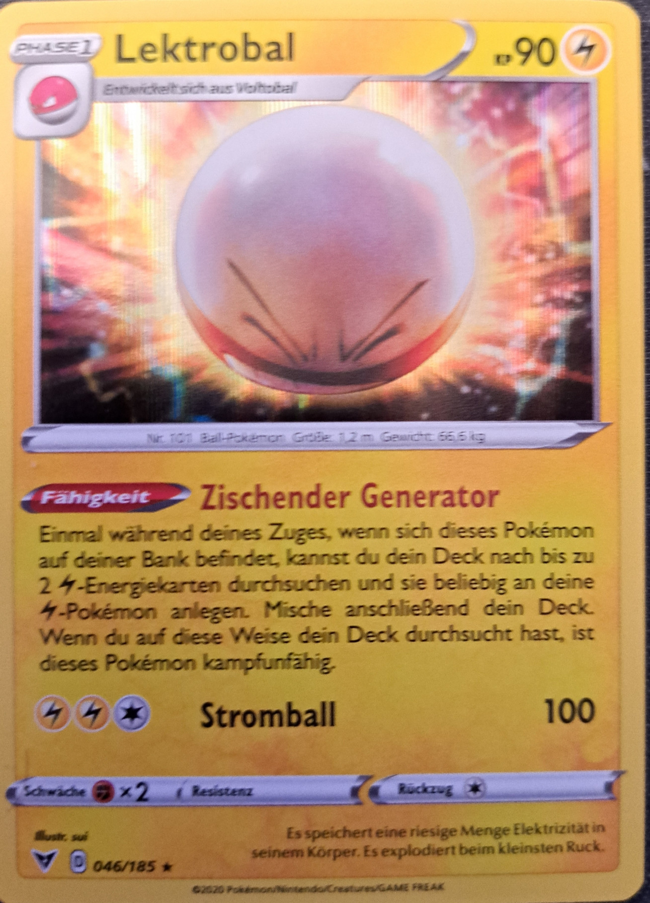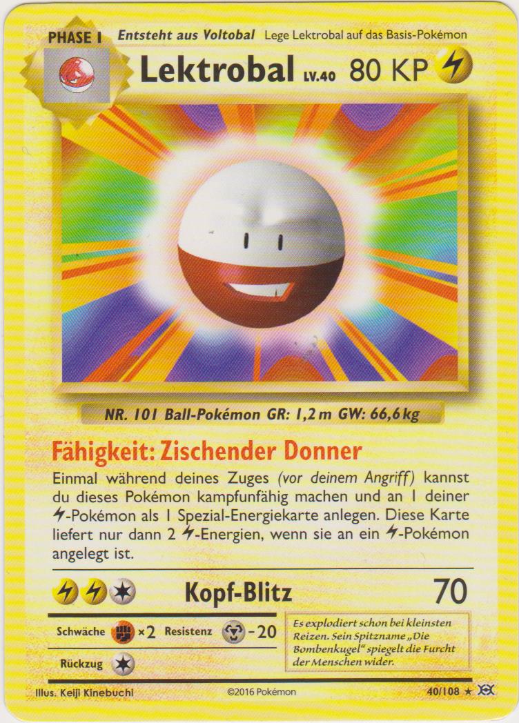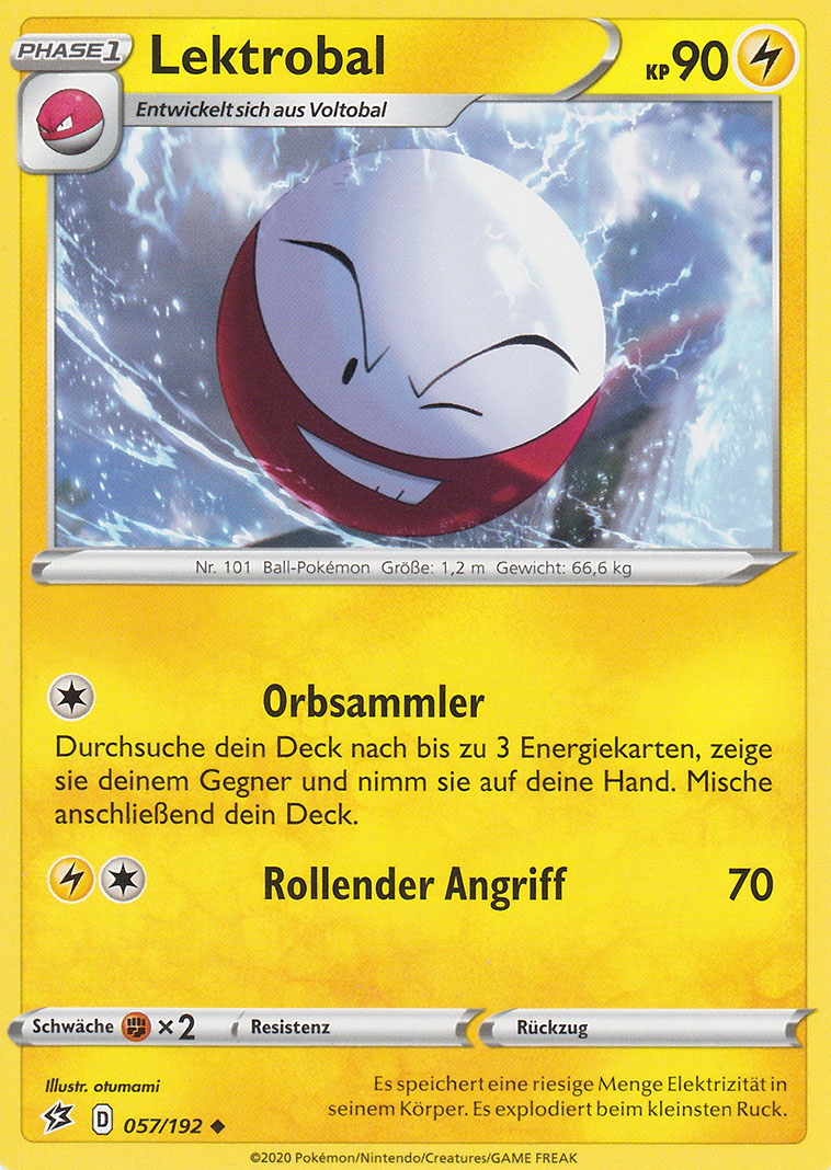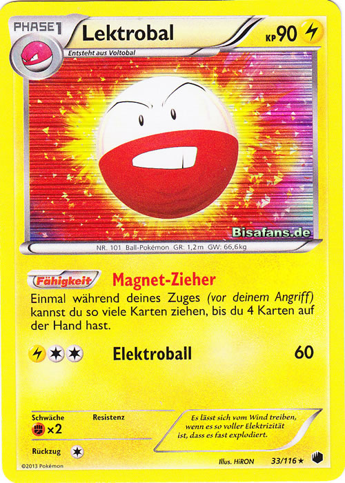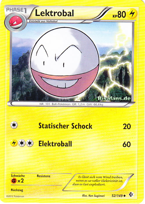 - R LEKTROBAL ernährt sich von Elektrizität aus der Atmosphäre. An Tagen, an denen es blitzt, explodiert dieses POKéMON dauernd, da es zu viel Elektrizität zu sich nimmt.