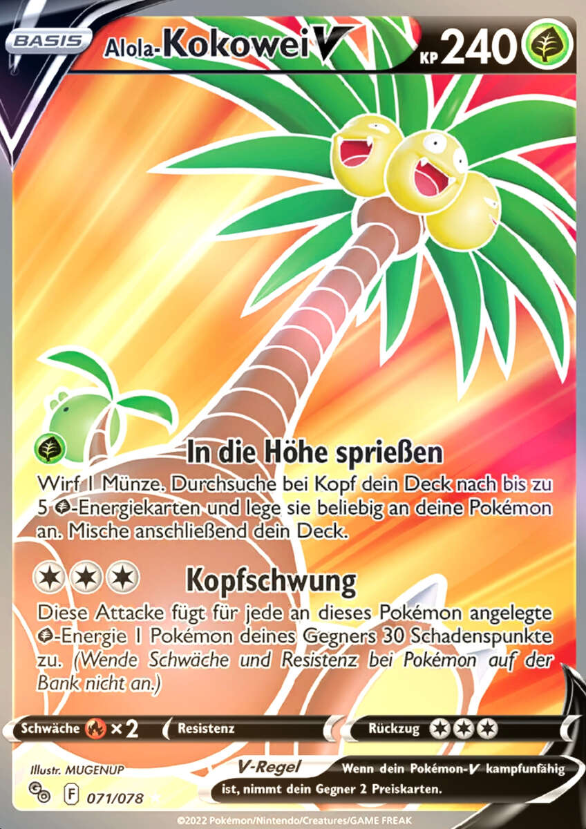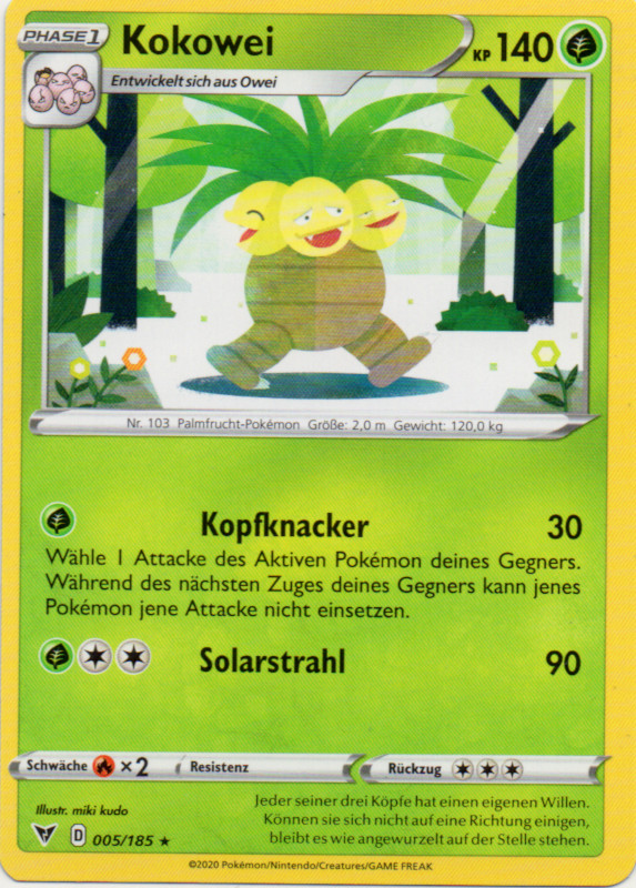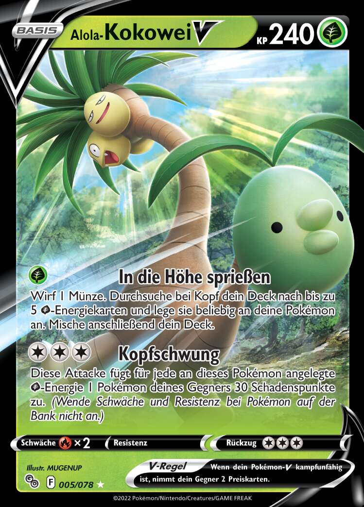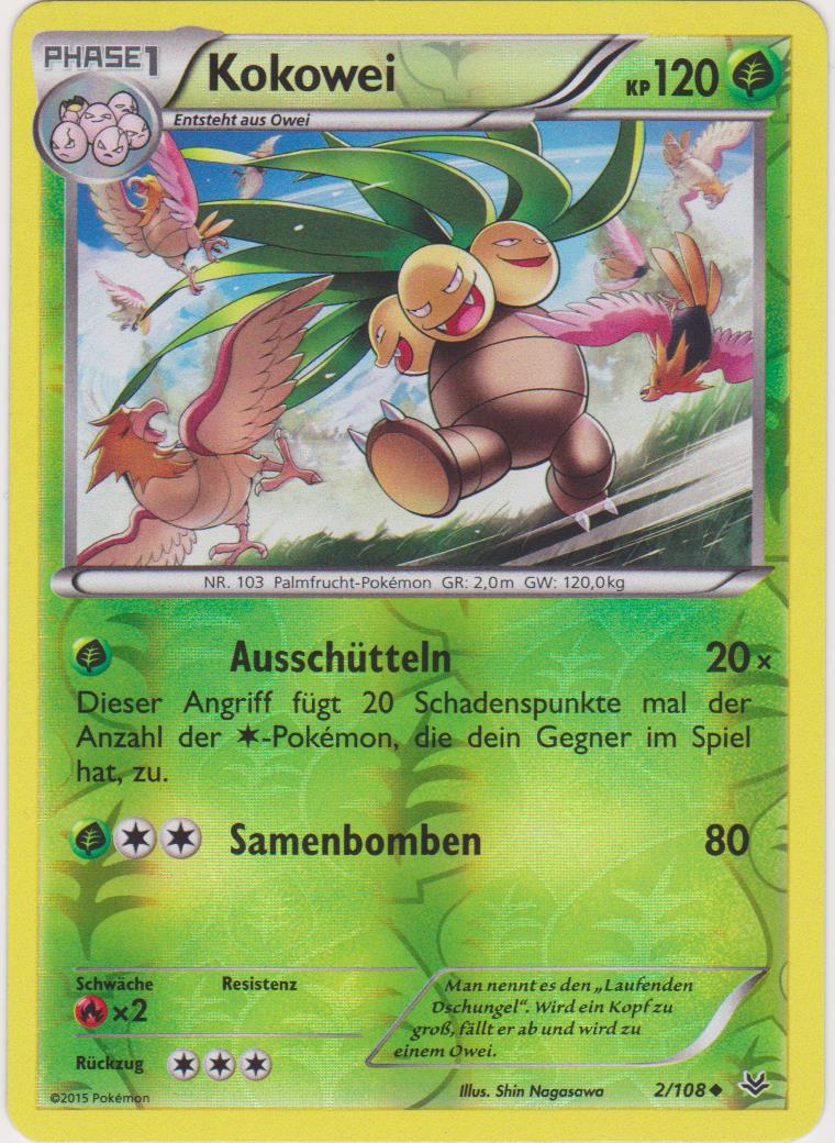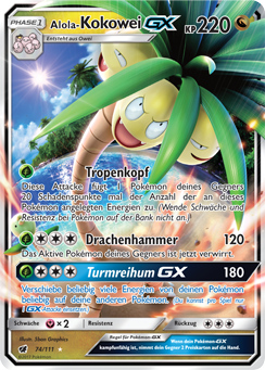 Durch die Kombination von Reiche Ernte und Bizarroraum hat Alola-Kokowei eine Nische, in der nur das offensiv allerdings deutlich harmlosere Trombork eine direkte Konkurrenz darstellt. Mit Draco Meteor und Blättersturm hat es zwei starke STABs, deren negative Zusatzeffekte durch Krafttausch an den Gegner weitergegeben werden können. Schlafpuder ist eine Alternative, die eventuelle Konter des Gegners lahmlegen kann, allerdings ist die Attacke sehr unzuverlässig. Die EVs garantieren das Überleben von Kapu-Falas ungeboosteter Mondgewalt, und lassen Kokowei zu einer hohen Wahrscheinlichkeit auch Alola-Knoggas Flammenblitz überstehen.
