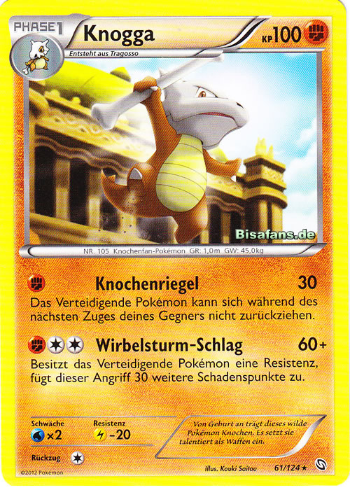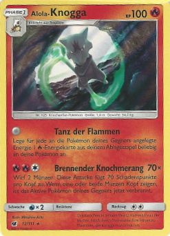 Eine gute Antwort auf Stahltypen und Kapu-Riki sowie andere Elektro-Pokémon. Der Kampfknochen verdoppelt den physischen Angriff, Flammenblitz und Schattenknochen sind die beiden STAB-Moves. Knochmerang (auch Irrlicht) hauptsächlich um Königsschild von Durengard zu umgehen (aufpassen auf schnellere Durengard), Irrlicht um einwechselnde Bodenpokemon etc. zu schwächen. Wahlweise auch auf diesem Slot Schwerttanz, um Druck auszuüben und dadurch evtl. Wechsel erzwingen.