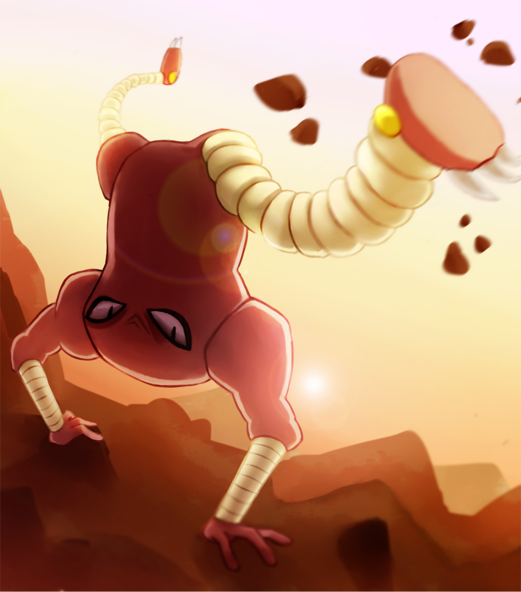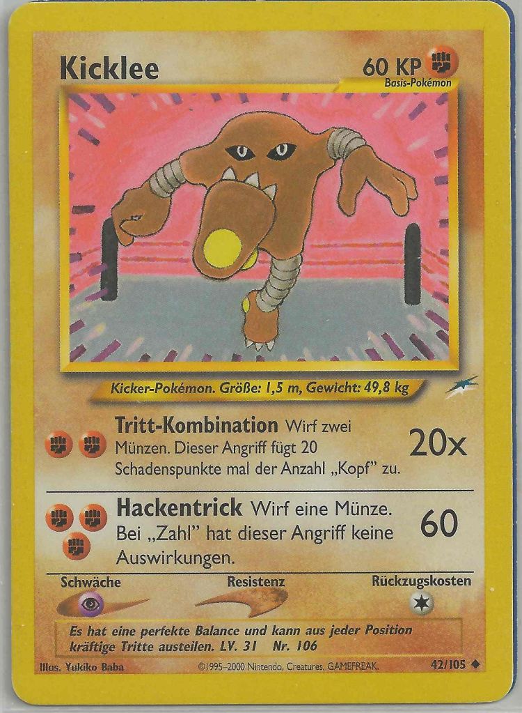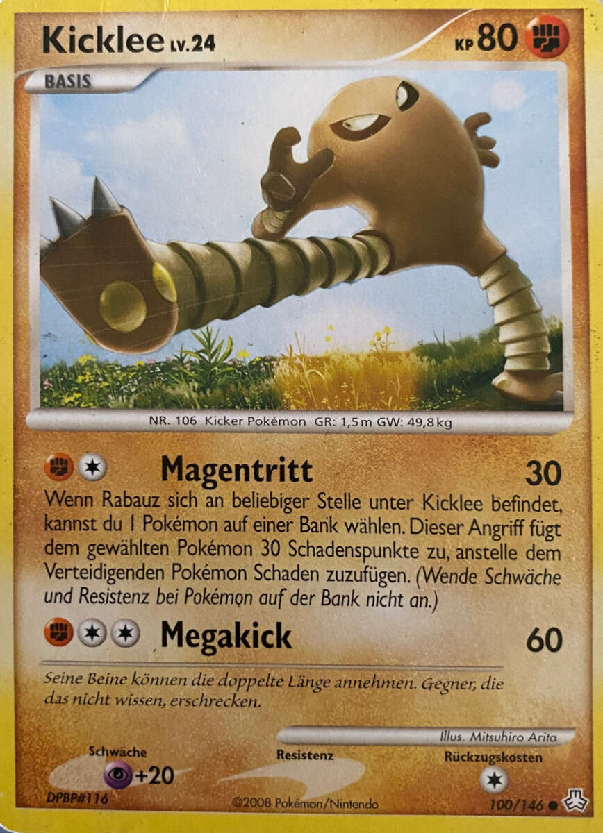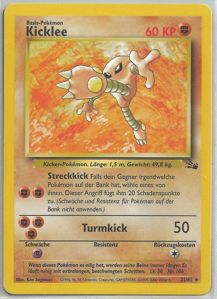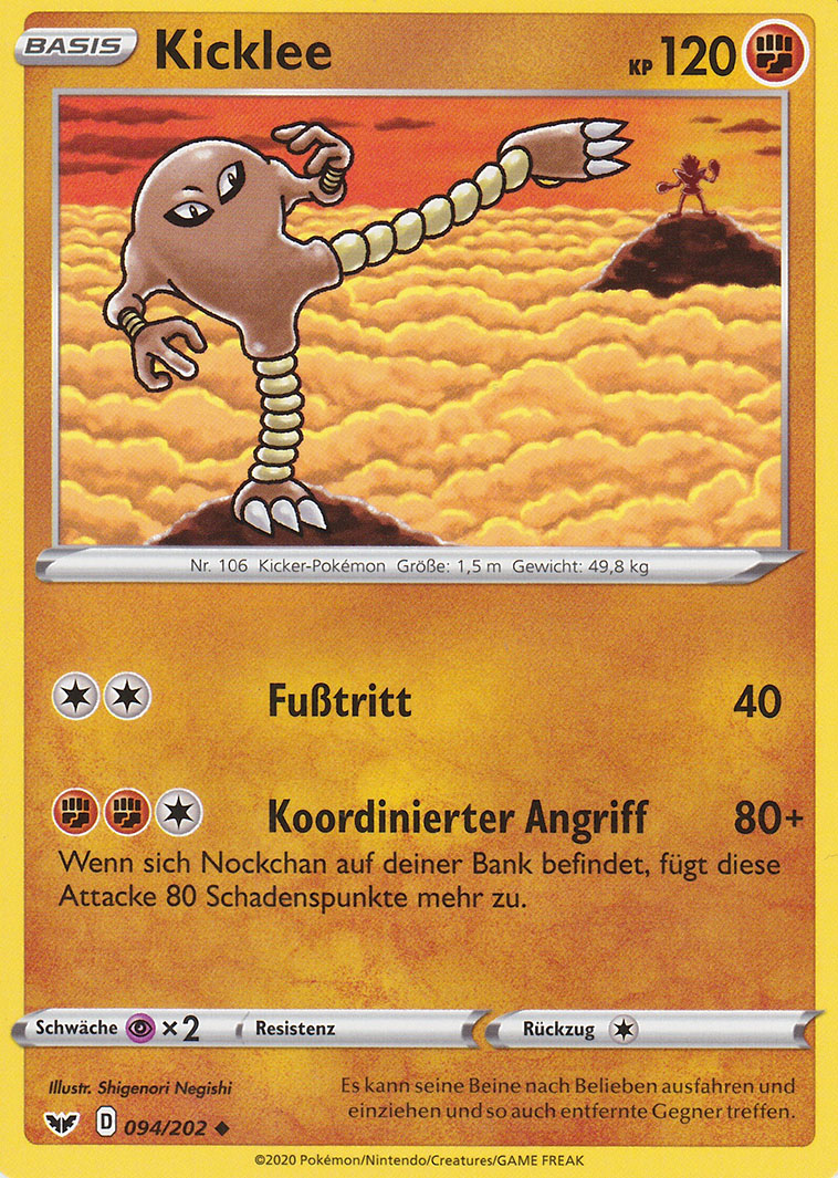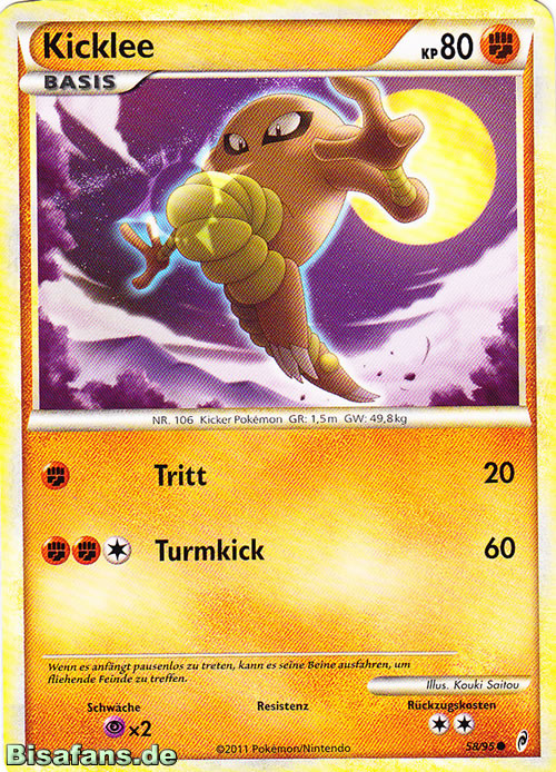 - S Dieses Pokémon ist auch als "Kick-Dämon" bekannt. Es kann bei Bedarf seine flexiblen Beine im Kampf verlängern oder verkürzen.