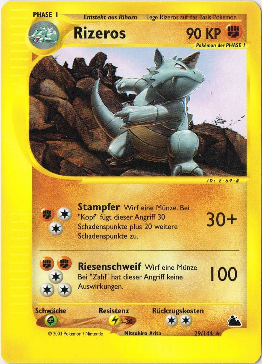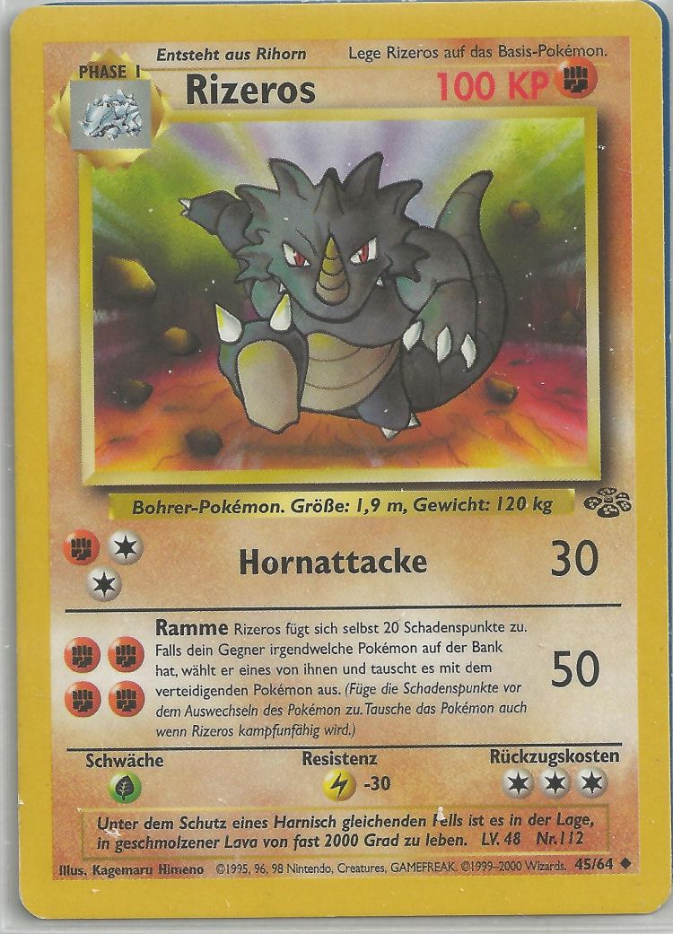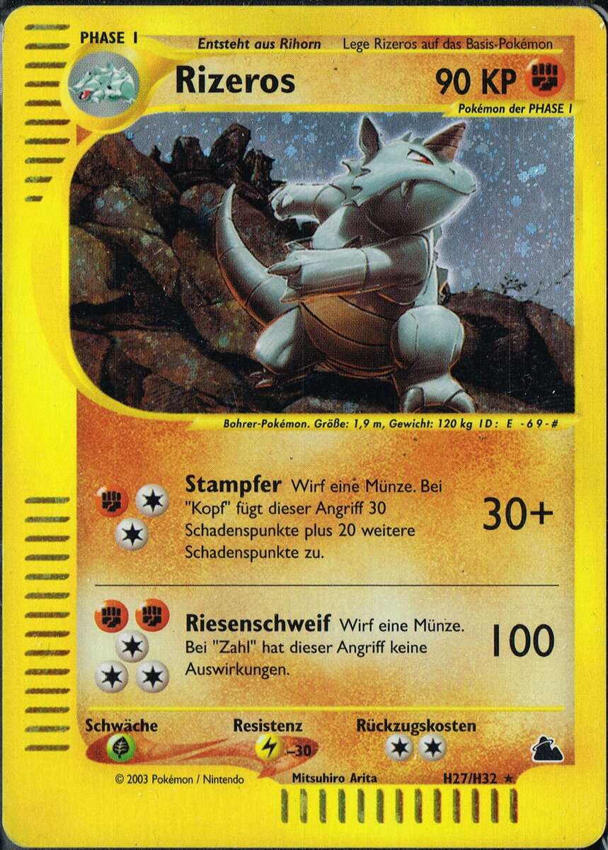 - AS Rizeros hat ein Horn, das es als Bohrer benutzen kann. Damit zerstört es Felsblöcke und Steine. Dieses Pokémon rammt sein Horn manchmal in Ströme von Magma. Seine panzerähnliche Haut schützt es dabei vor der Hitze.