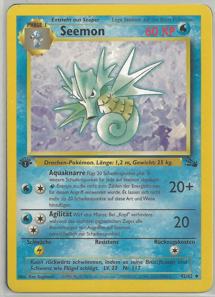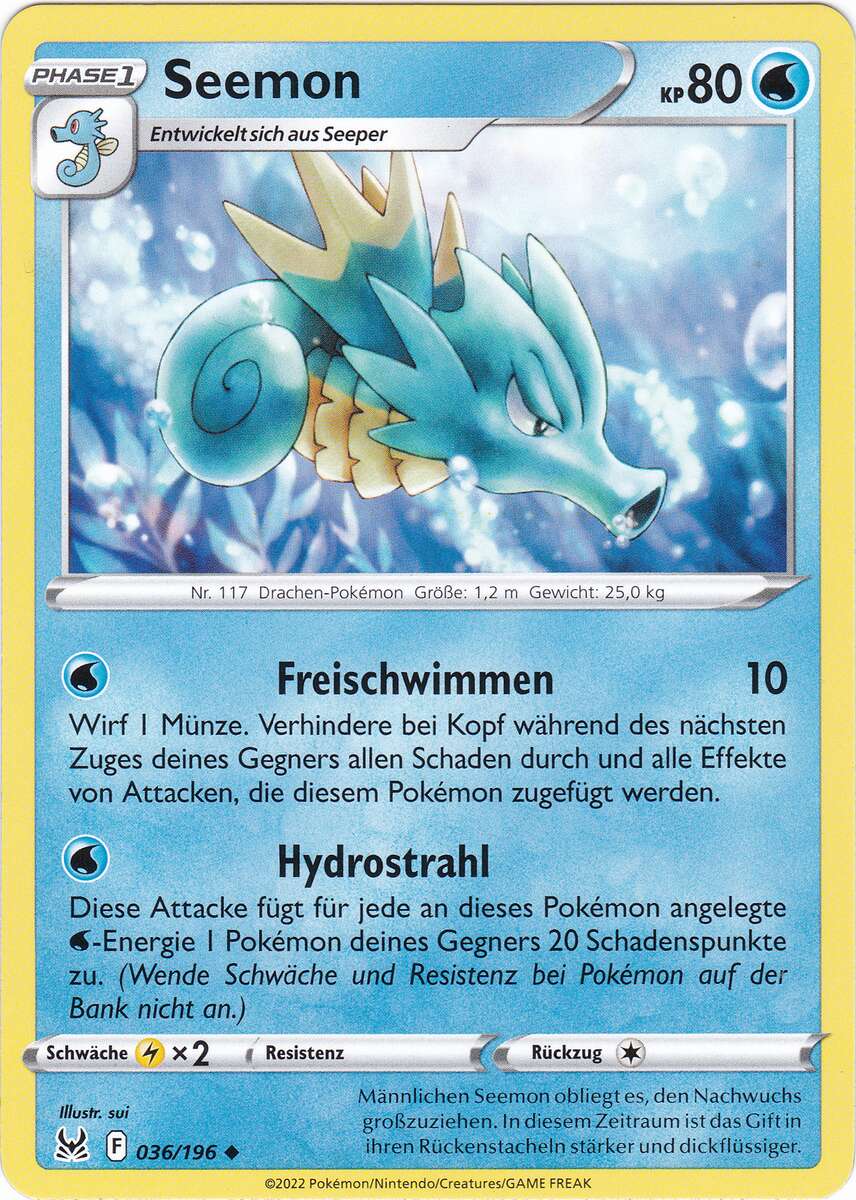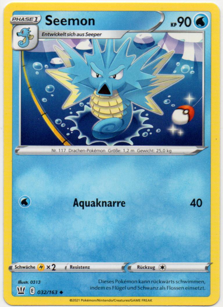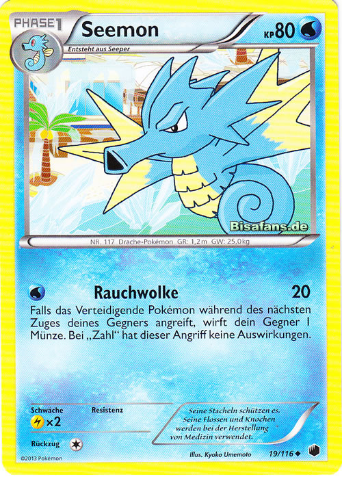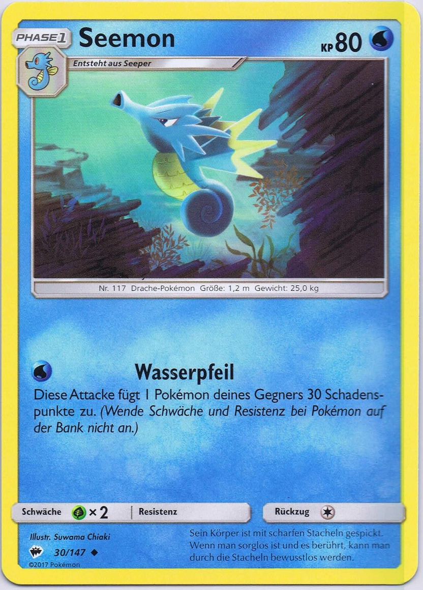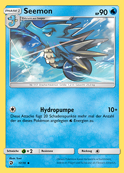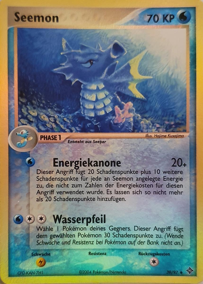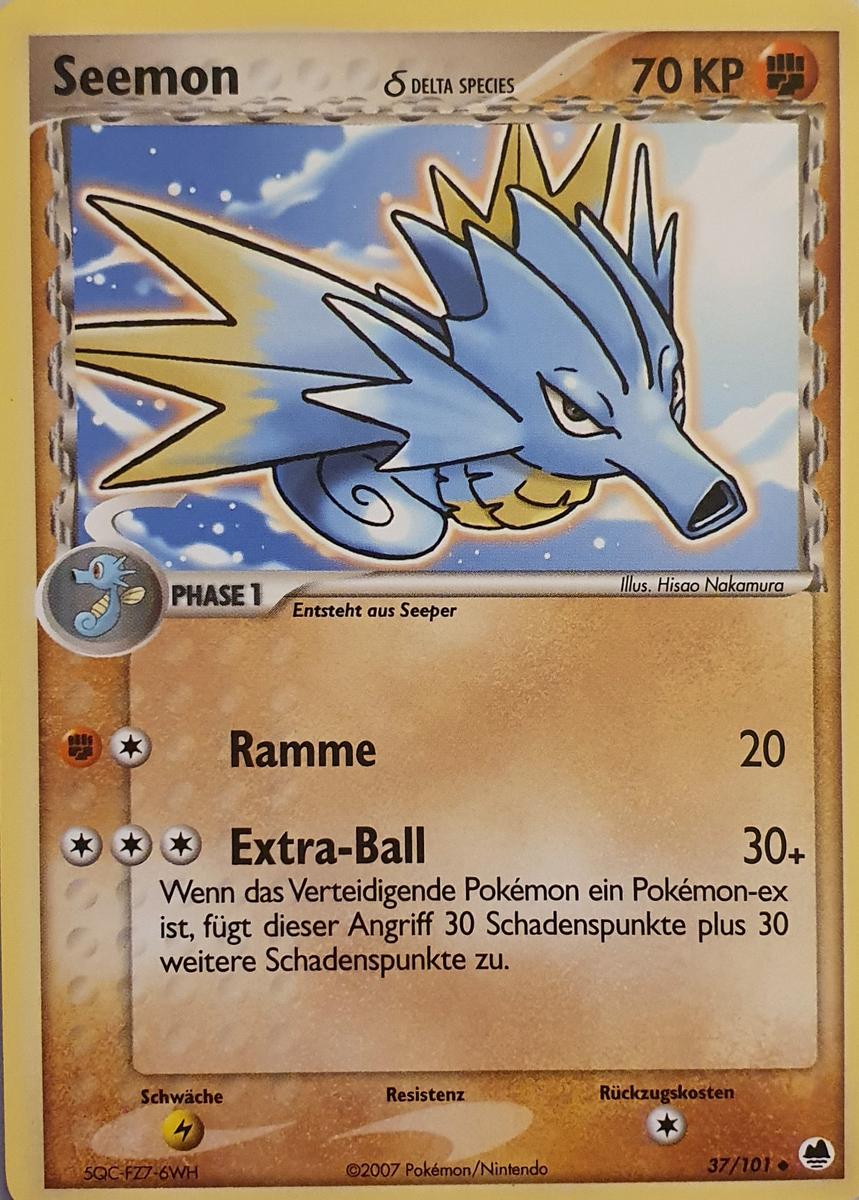 - G Die Rückenflossen dieses Pokémon sondern Gift ab. Im Schlaf klammert sich Seemon an Korallen fest.