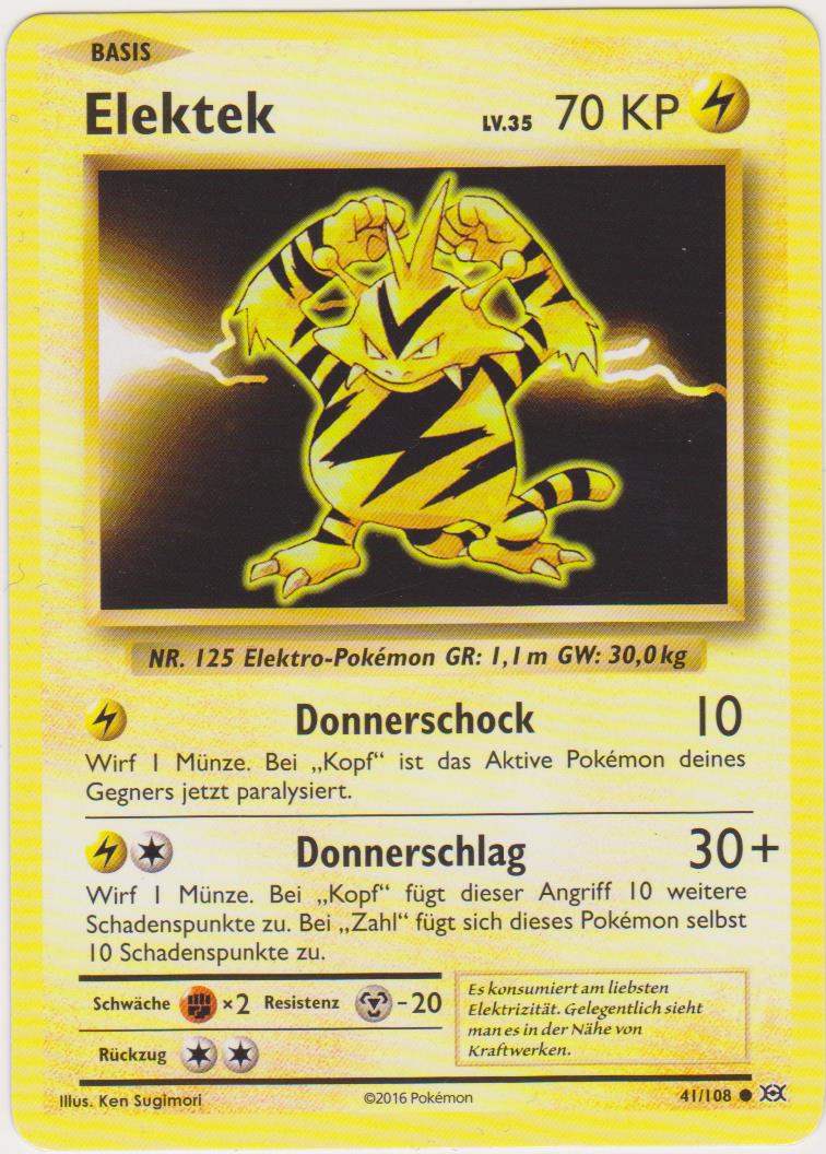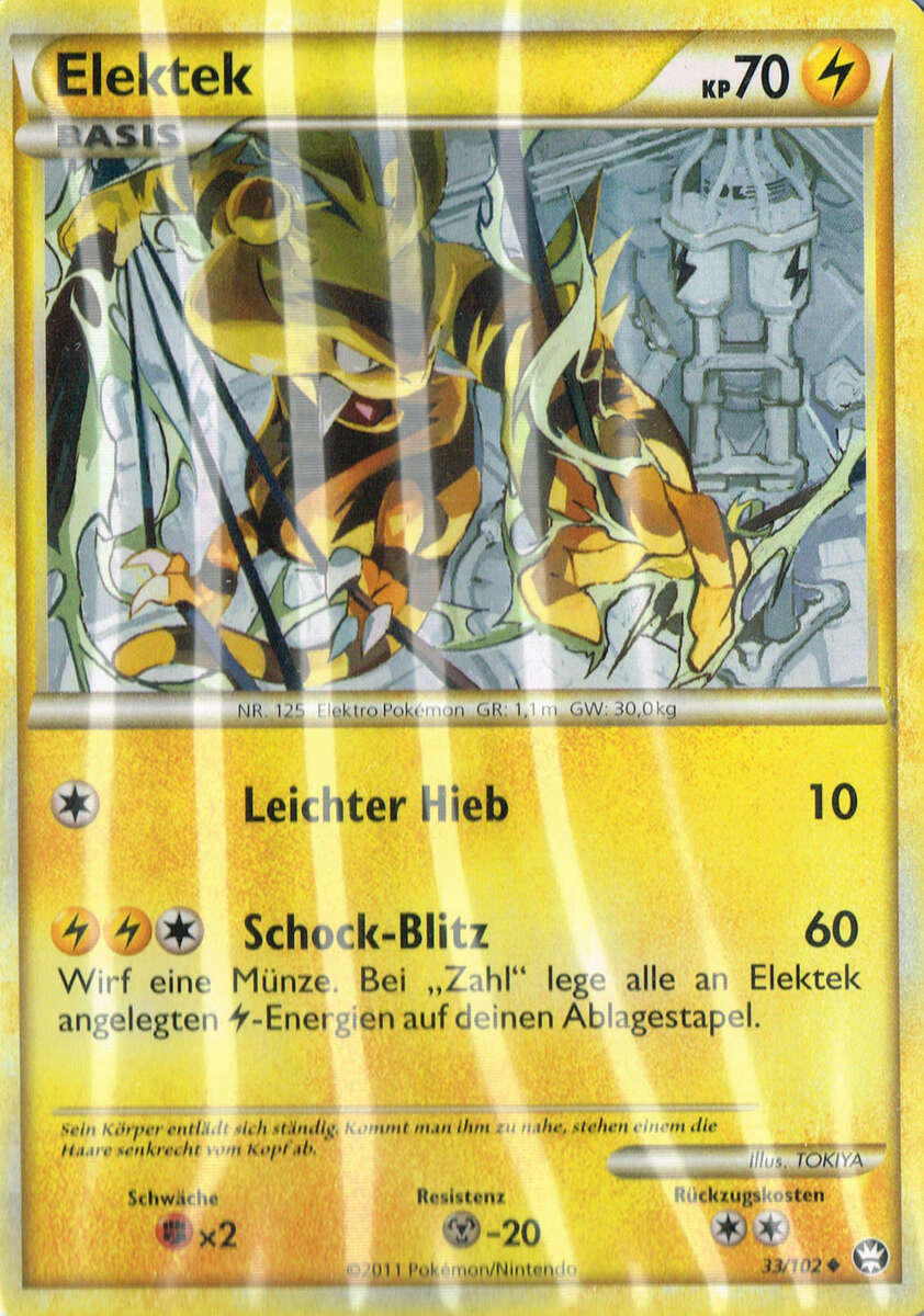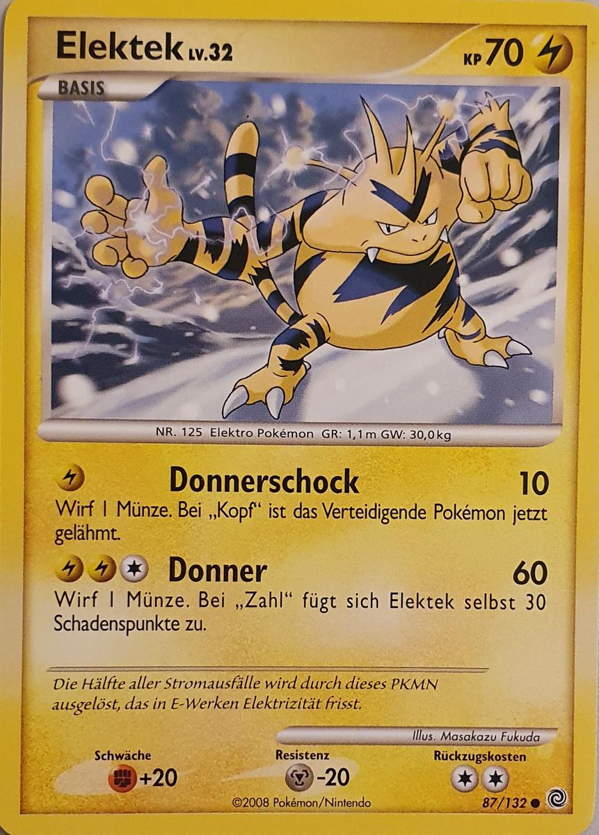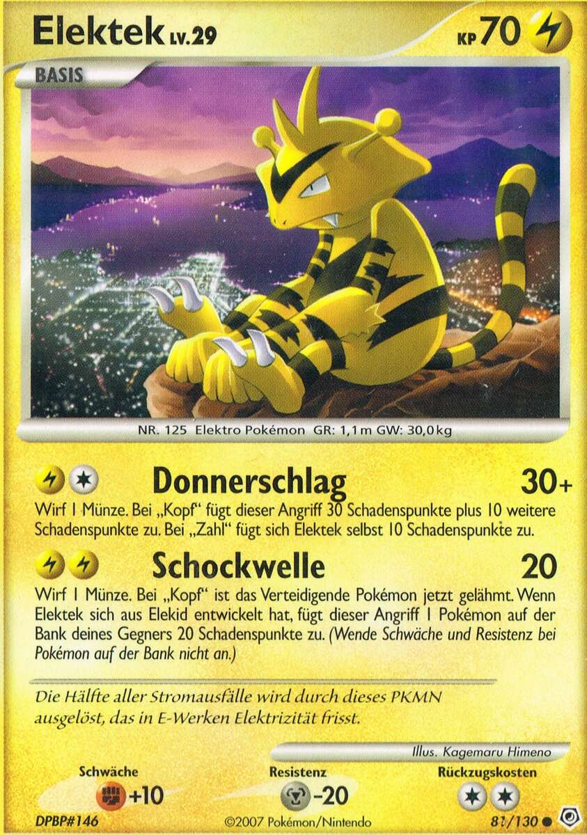- RS Bei Gewitter konkurrieren diese PKMN, wie viele Spannungseinheiten sie erreichen, wenn sie vom Blitz getroffen werden. Einige Ortschaften benutzen ELEKTEK an Stelle von Blitzableitern.