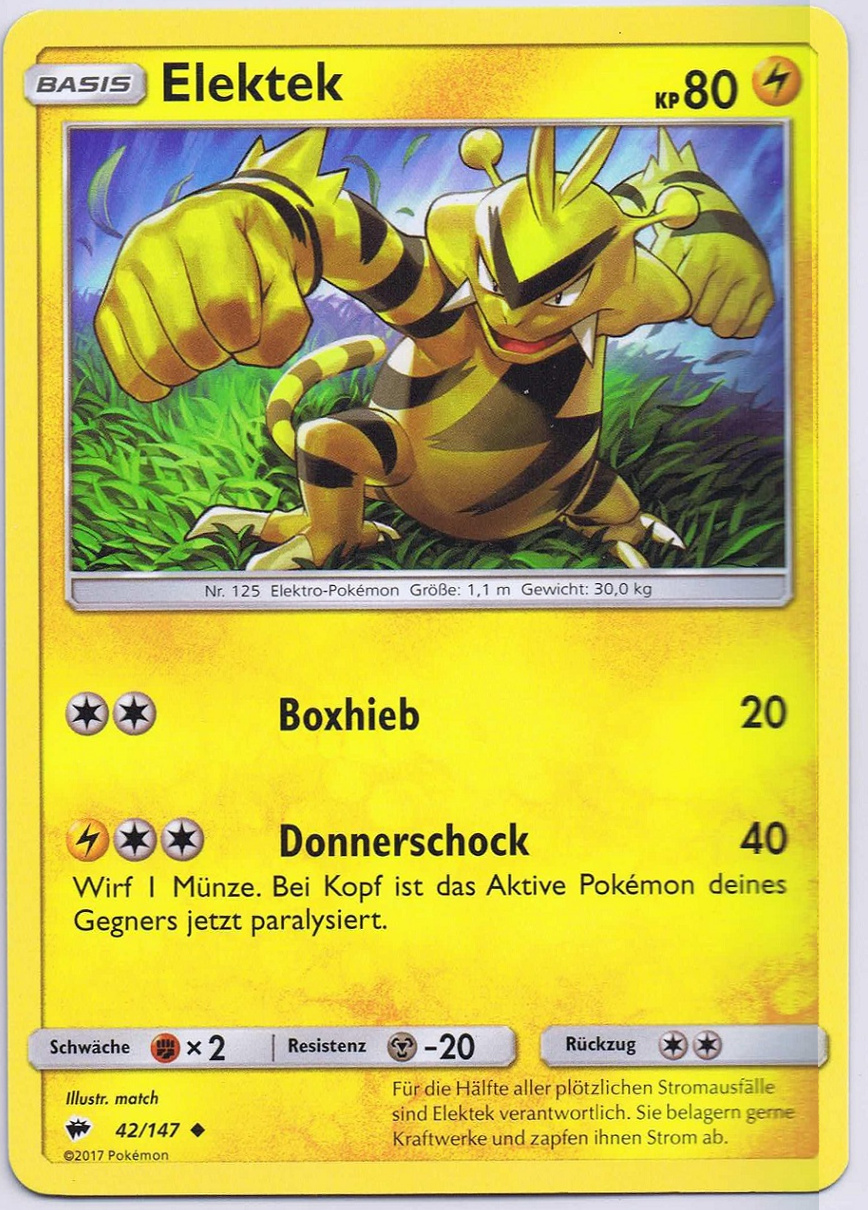 - S Bei Gewitter konkurrieren diese PKMN, wie viele Spannungseinheiten sie erreichen, wenn sie vom Blitz getroffen werden. ELEKTEK dient auch als Blitzableiter.