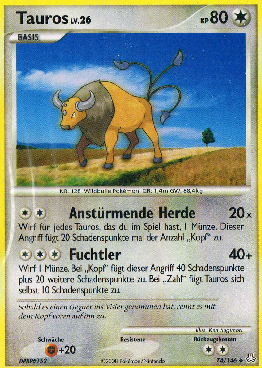 - S Dieses POKéMON ist nur zufrieden, wenn es kämpfen kann. Wenn TAUROS keinen Gegner findet, sucht es sich robuste Bäume und haut sie um, um sich abzureagieren.