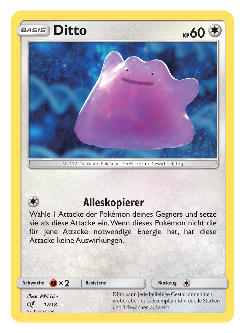 - S Dieses Pokémon kann die Anordnung seiner Körperzellen verändern und sich so in eine perfekte Kopie seines Gegners verwandeln.