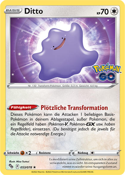 - GO Ditto verändert seine Zellstruktur, um sich in eine andere Form zu verwandeln. Wenn es sich dabei jedoch auf sein Gedächtnis verlässt, unterlaufen diesem Pokémon schon mal Fehler.