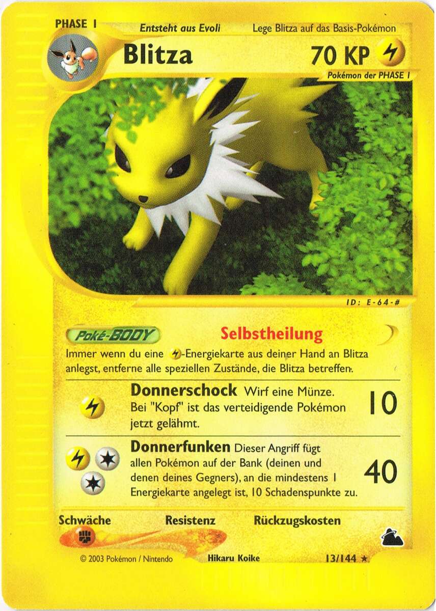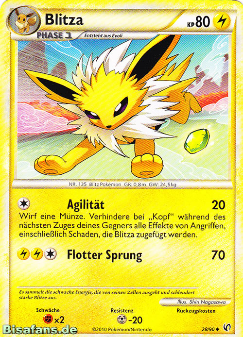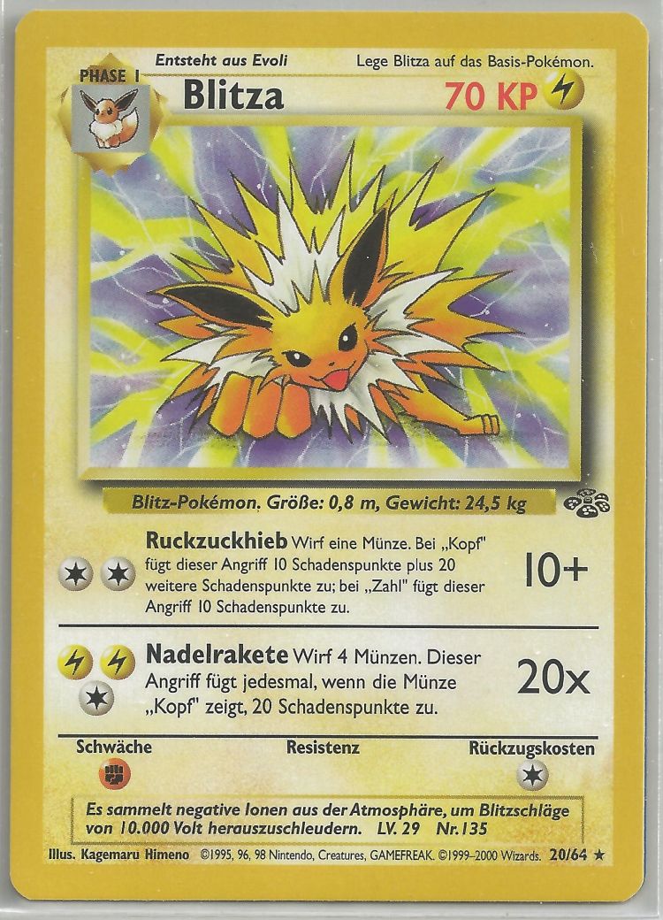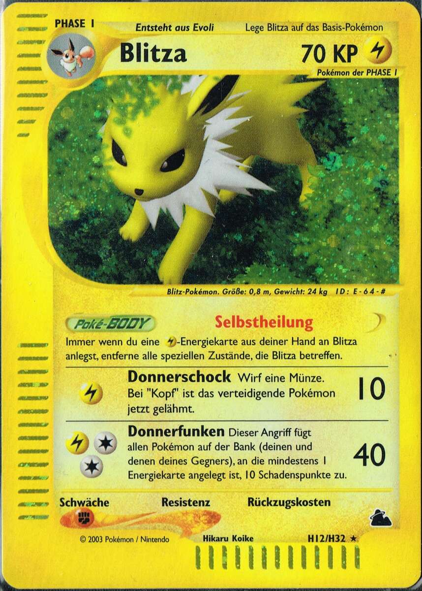 - RB Dieses Pokémon entzieht der Atmosphäre Ionen, die es in Blitze von 10000 Volt Stärke umwandelt.