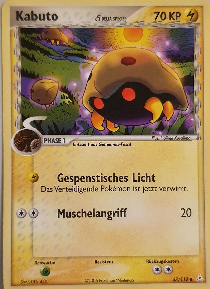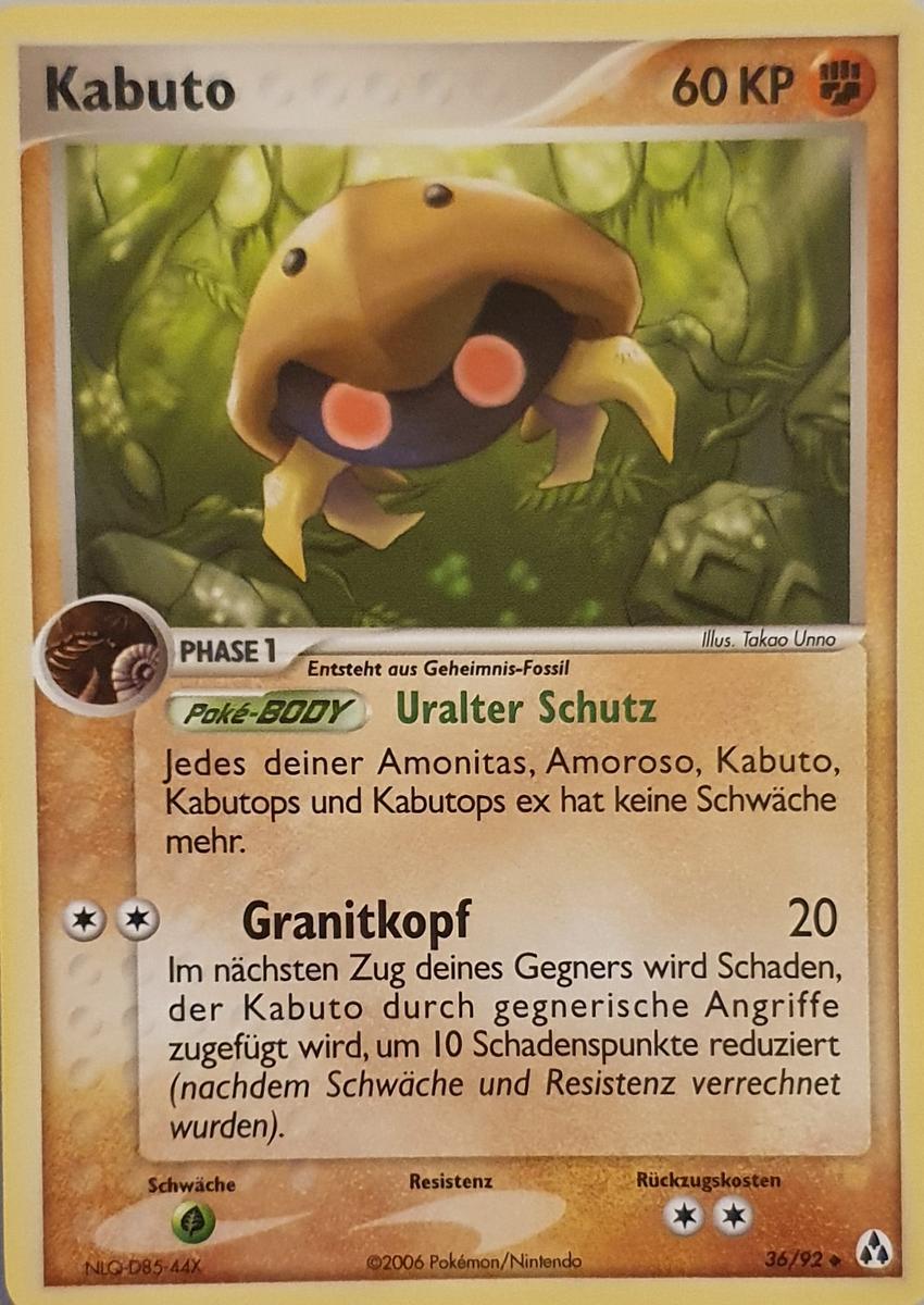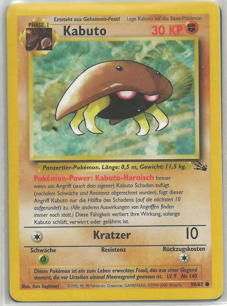 - S KABUTO ist ein PKMN, das aus einem Fossil reproduziert wurde. Selten wurden lebende Exemplare dieser Art entdeckt. Es hat sich seit 300 Mio. Jahren nicht verändert.