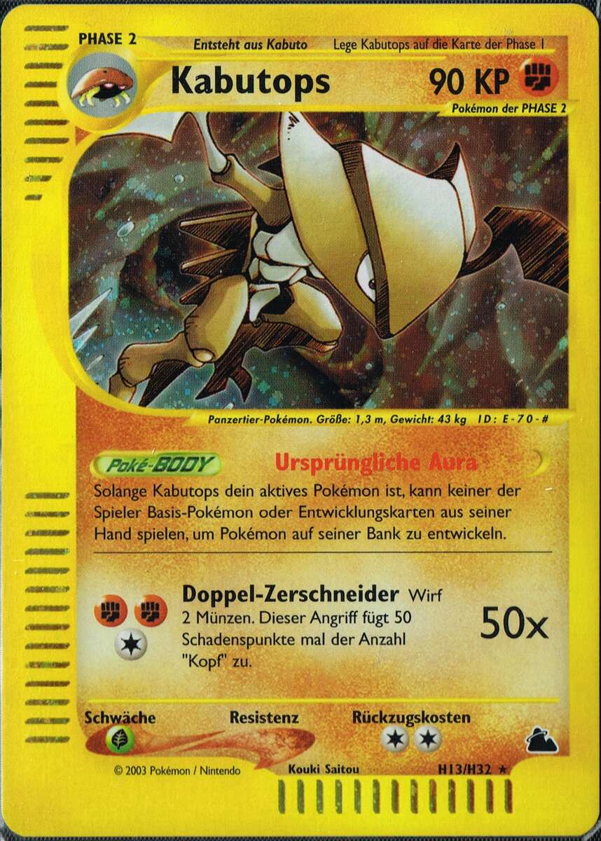 - SWKS Kabutops schlitzt seine Beute auf und saugt ihre Körpersäfte aus. Die Überreste dienen als Nahrung für andere Pokémon.
