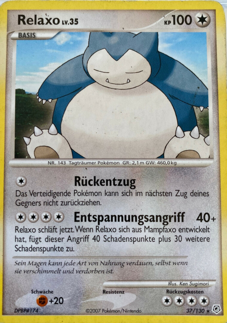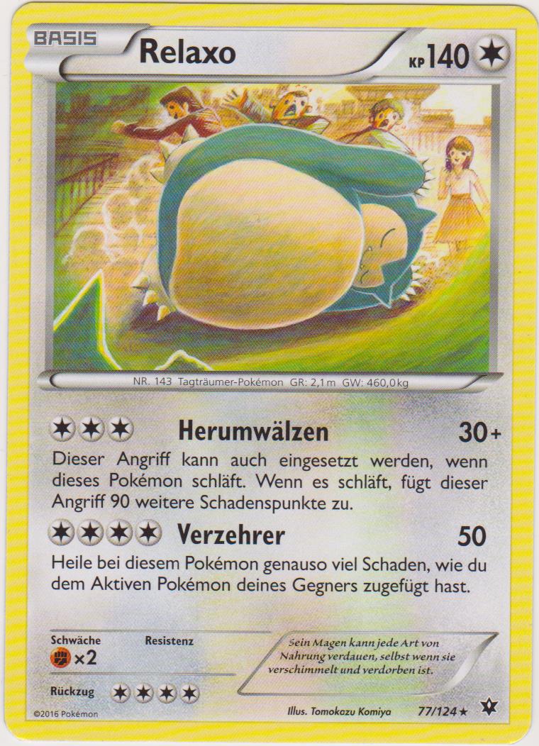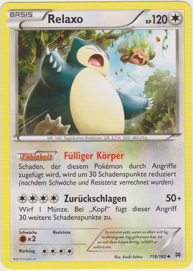 Relaxo kann durch seinen immensen Bulk meistens problemlos Bauchtrommel einsetzen und danach alles mindestens 2HKOen. Die 50% KP, die es durch Bauchtrommel verliert, werden durch die Giefebeere in Kombination mit der Fähigkeit Völlerei direkt wieder ausgeglichen. Rückkehr dient als STAB. Erdbeben dient der Coverage bzw. um neutralen Schaden, vor allem gegen Geister wie Gengar und Mimikyu anzurichten. Alternativ kann man auch Flammenwurf spielen, womit man das 1v1 gegen Katagami gewinnt. Mit Aufbereitung hat man die Möglichkeit, sich die Giefebeere wiederzuholen. 244 KP-EVs bringen Relaxo auf eine gerade Anzahl an KP, sodass sich die Giefebeere direkt nach Bauchtrommel aktiviert. Mit 52 SpV-EVs lebt es Kapu-Falas Psychokinese ohne Leben-Orb, kann sich boosten und anschließend noch eine Psychokinese einstecken. Der Rest geht in die Verteidigung.