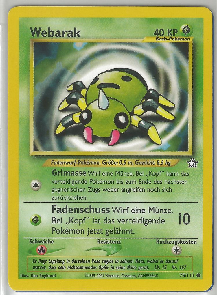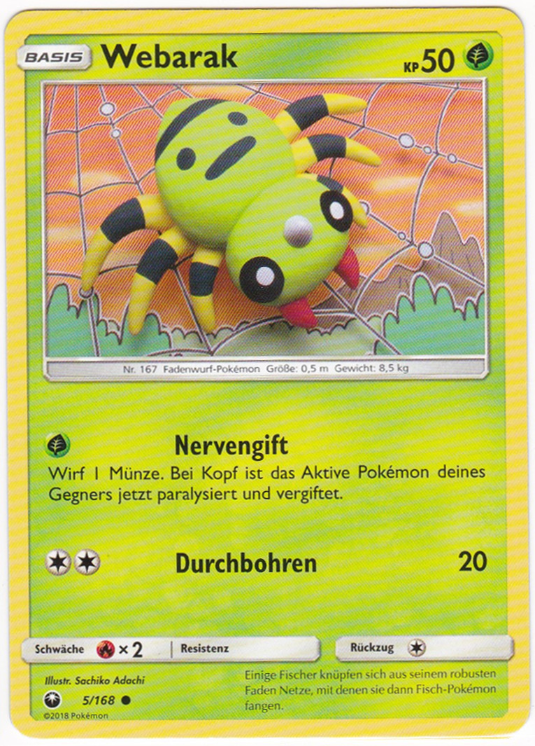 - GO Das von Webarak gesponnene Netz ist sein zweites Nervensystem. Dieses Pokémon kann anhand der feinen Vibrationen der Netzfäden bestimmen, welche Art von Beute sich darauf befindet.