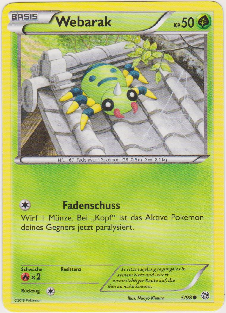 - ORAS Das von Webarak gesponnene Netz ist sein zweites Nervensystem. Dieses Pokémon kann anhand der feinen Vibrationen der Netzfäden bestimmen, welche Art Beute sich darauf befindet.