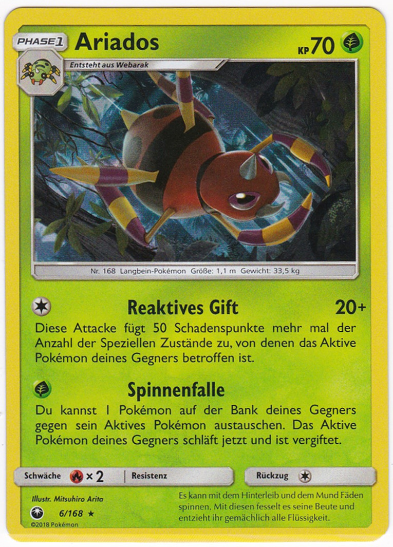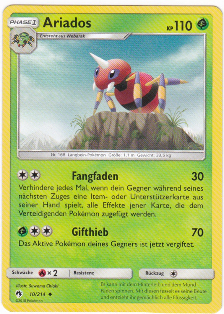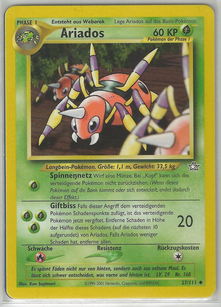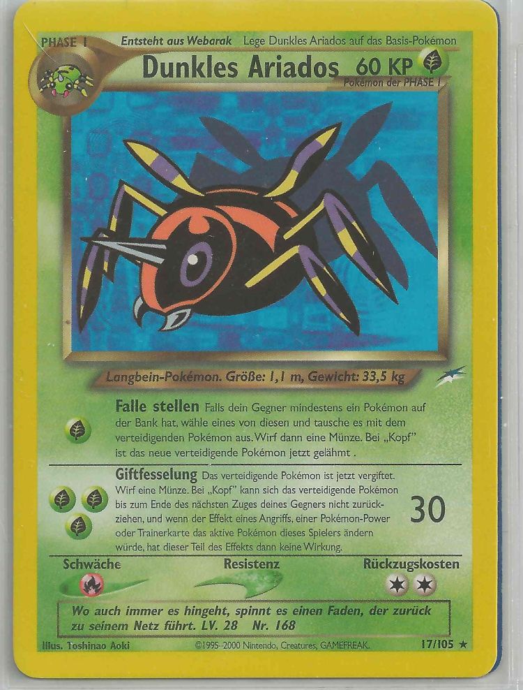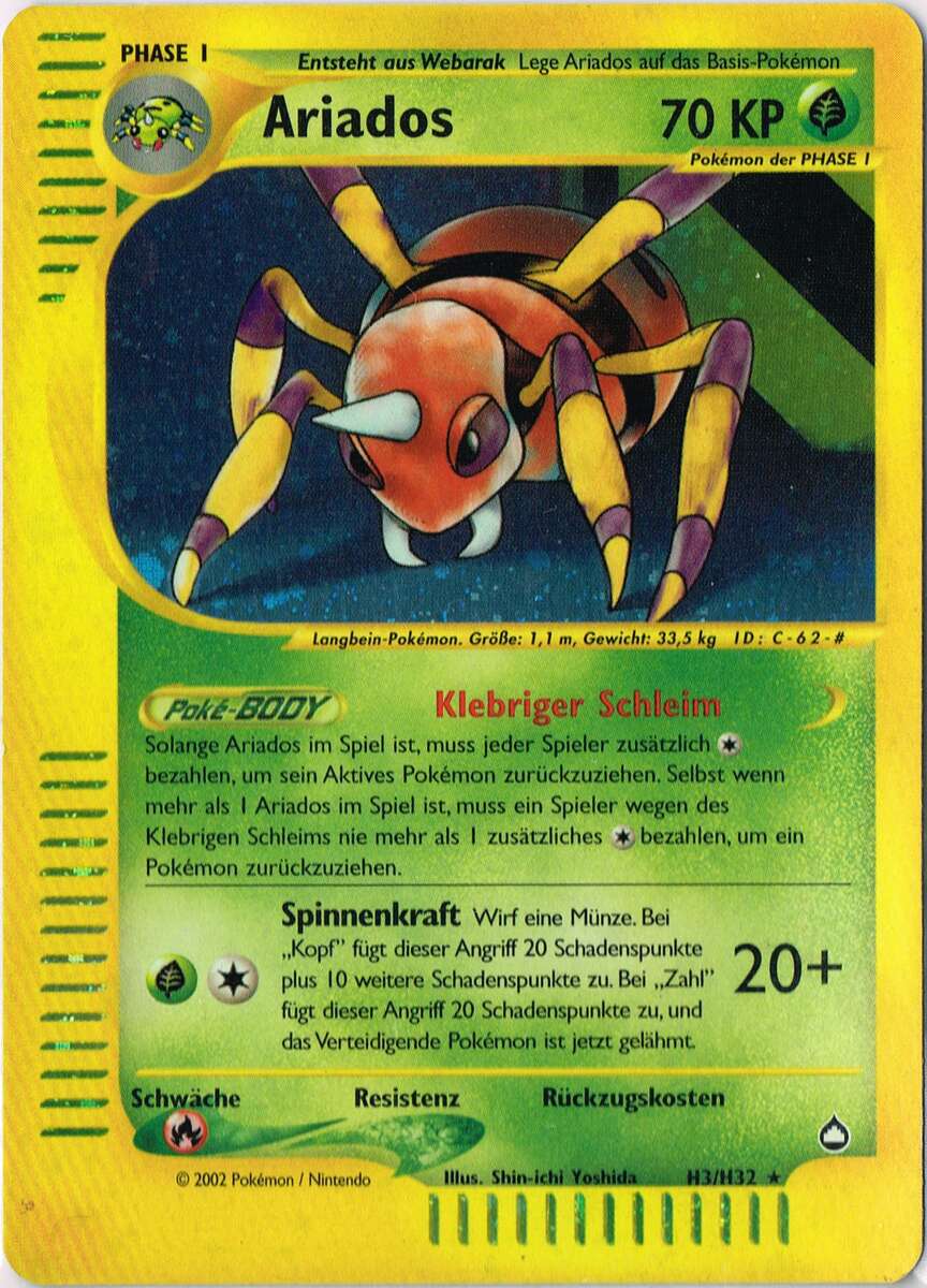 - RS ARIADOS hat kleine hakenförmige Krallen an seinen Füßen. Damit kann es an Decken und Wänden entlang flitzen. Dieses POKéMON erdrückt seine Gegner mit starkem, dünnem Seidenfaden.