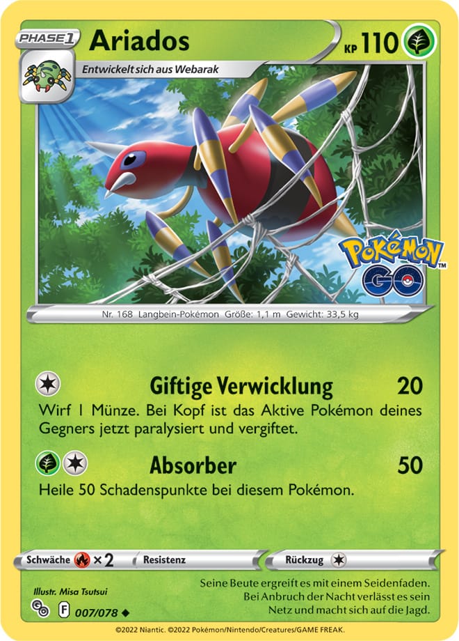 - GO Ariados hat kleine hakenförmige Krallen an seinen Füßen. Damit kann es an Decken und Wänden entlangflitzen. Dieses Pokémon schnürt seine Gegner mit einem starken, dünnen Seidenfaden ein.