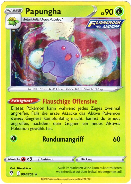 - GO Papungha nutzt den Südwind, um das Meer zu überqueren und in ferne Länder zu fliegen. Dieses Pokémon sinkt zu Boden, wenn es während seines Fluges an kalte Luftschichten stößt.
