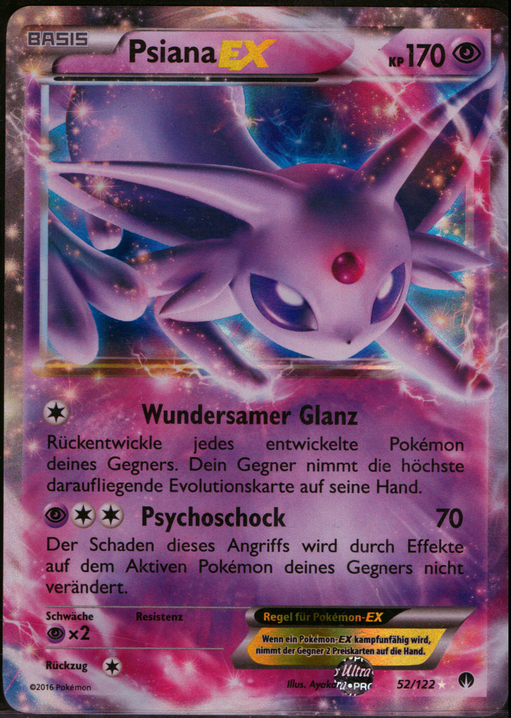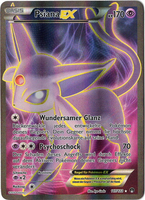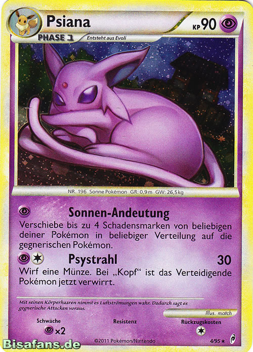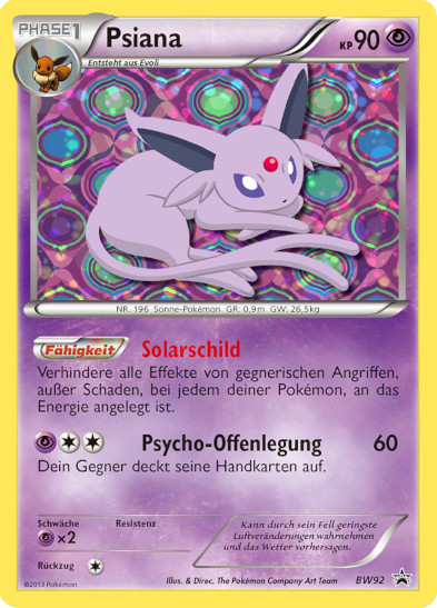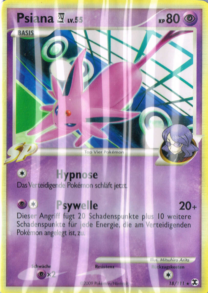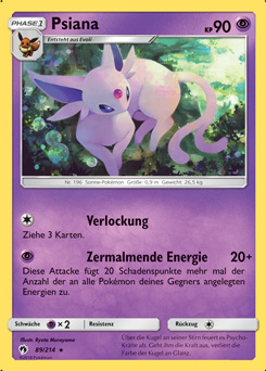 Endgerät für Evolis Macht der Neun. Mit Kraftvorrat mit einer Basisstärke von 200, +2 SpA und +2 Init wuchtet Psiana dann alles um, was sich nicht hinter einem Schutzschild versteckt. Selbst Brüller funktioniert dank Magiespiegel nicht im geringsten. Gegen Unlichtpokémon muss man dann doch den schwächeren Zauberschein mitnehmen. Ansonsten kann man auch eine Kraftreserve Feuer oder Elektro im Elektrofeld gegen Kaguron oder Grypheldis mitnehmen. Gedankengut ist eine weitere Setup-Möglichkeit wenn man wirklich gierig auf Boosts ist oder Evoils Setup missglückt ist. Die Überreste sorgen für konstante Heilung, aber auch eine Yapabeere oder ein Fokusgurt sind denkbare Items.