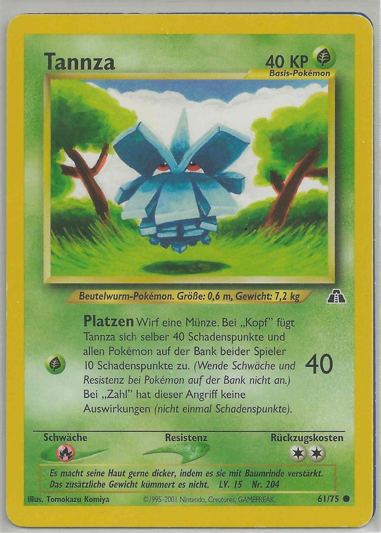 - GO Tannza hängt an Ästen und wartet auf Beute. Wenn man dieses Pokémon bei einer Mahlzeit stört, indem man den Baum, auf dem es sich befindet, schüttelt, fällt es herunter und explodiert ohne Vorwarnung.