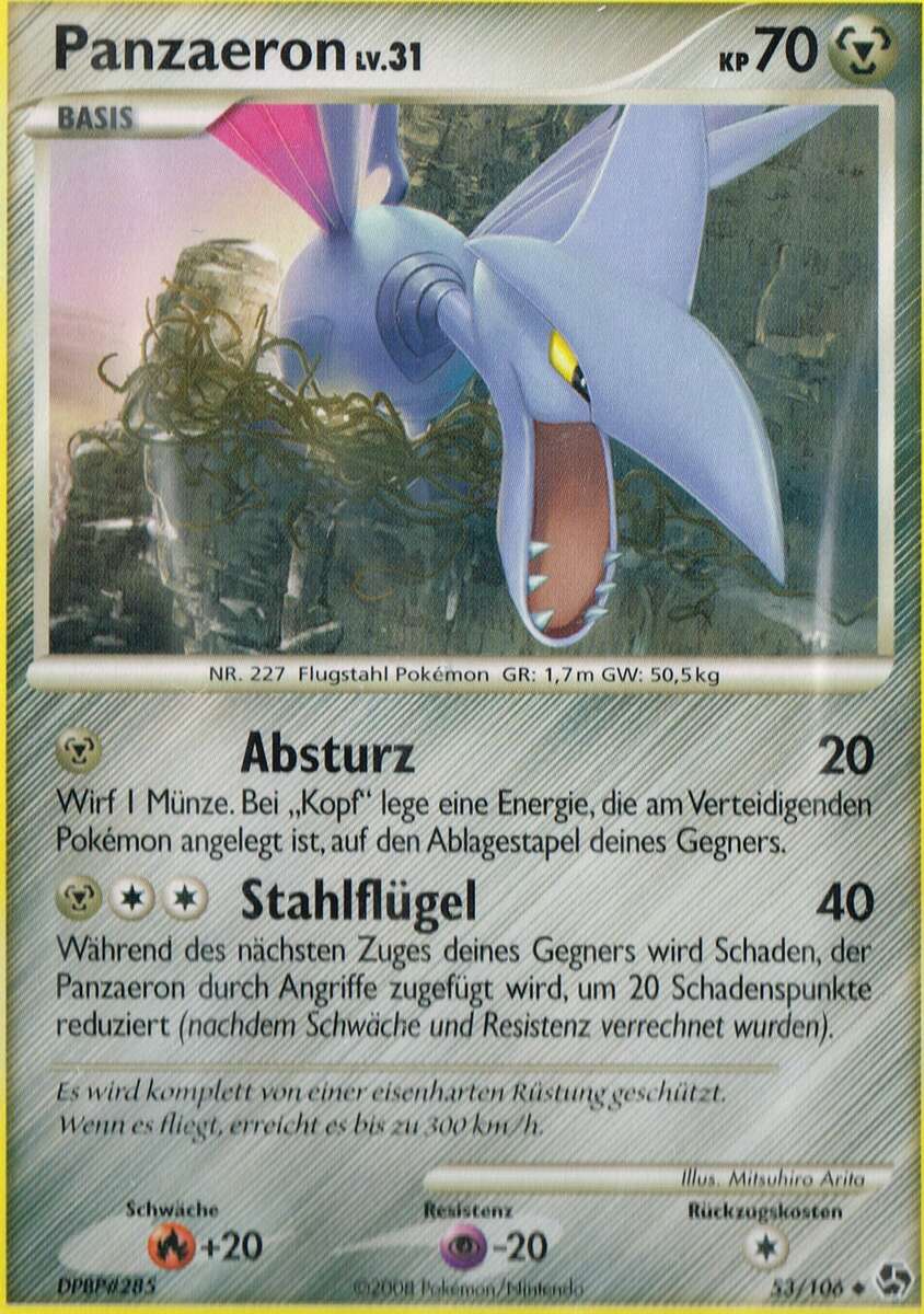 - R PANZAERON ist komplett in einen harten, schützenden Panzer eingehüllt. Dieses POKéMON fliegt 300 km/h. Es greift seine Feinde mit seinen messerscharfen Flügeln an.