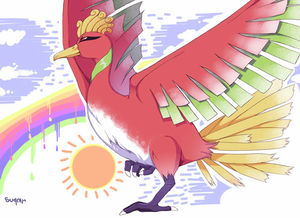 - ORAS Ho-Ohs Federn leuchten in sieben Farben, je nachdem aus welchem Winkel das Licht auf sie fällt. Die Federn sollen ihrem Besitzer Glück bringen. Dieses Pokémon lebt am Fuße eines Regenbogens.