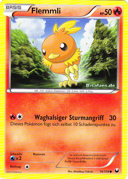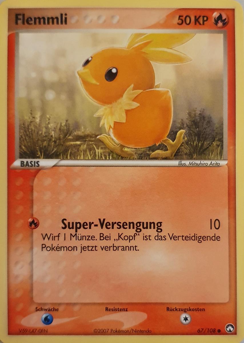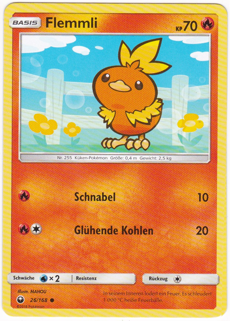 - S In FLEMMLIs Körper brennt eine Flamme. Wenn man es umarmt, beginnt es zu glühen. Dieses POKéMON trägt ein flauschiges Fell aus Daunen.