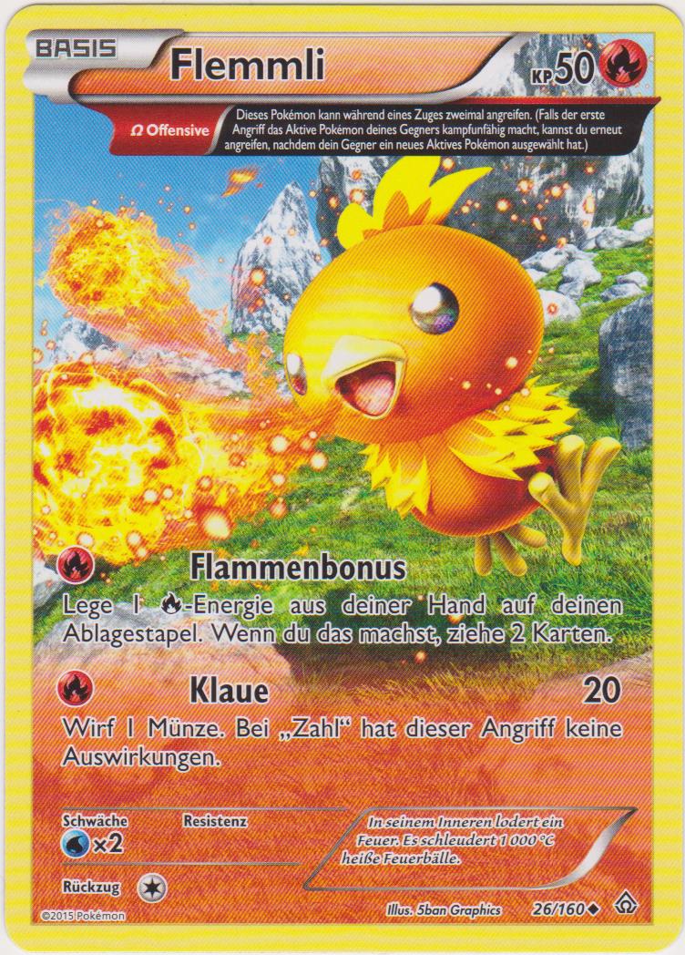 - AS In Flemmlis Körper brennt eine Flamme. Wenn man es umarmt, beginnt es zu glühen. Dieses Pokémon trägt ein flauschiges Fell aus Daunen.