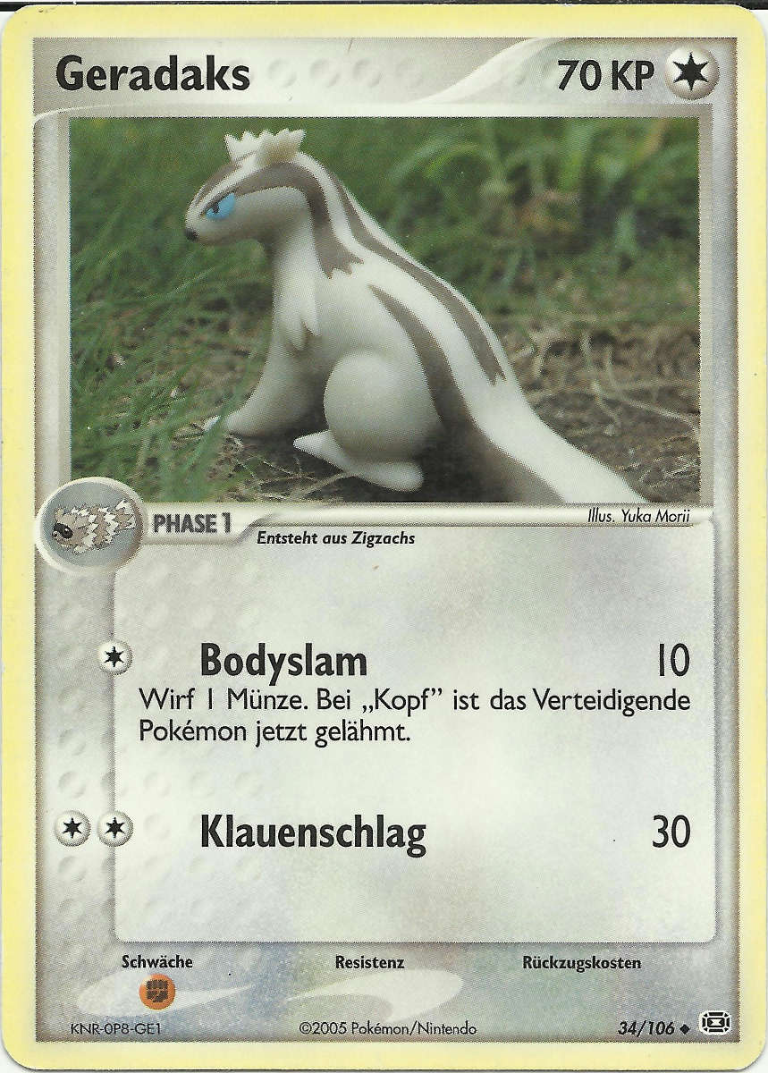 - R GERADAKS rennt immer mit vollem Tempo und nie im Zickzack, sondern nur gerade. Wenn ihm ein Hindernis im Weg ist, läuft es rechtwinklig daran vorbei. Für dieses POKéMON stellen leichte Kurven eine große Herausforderung dar.