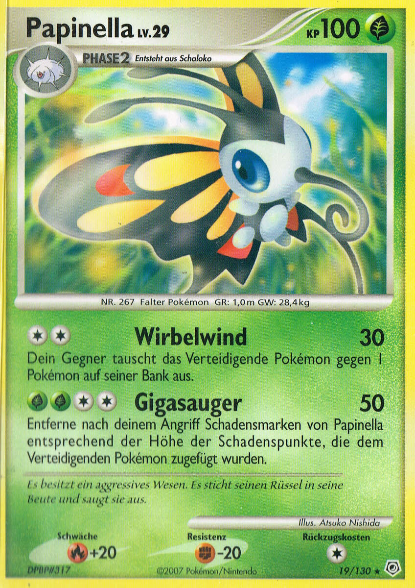 - AS Papinella hat einen langen Rüssel, der hervorragend zum Sammeln von Blütenpollen geeignet ist. Dieses Pokémon flattert im Frühlingswind herum und sammelt Blütenstaub.