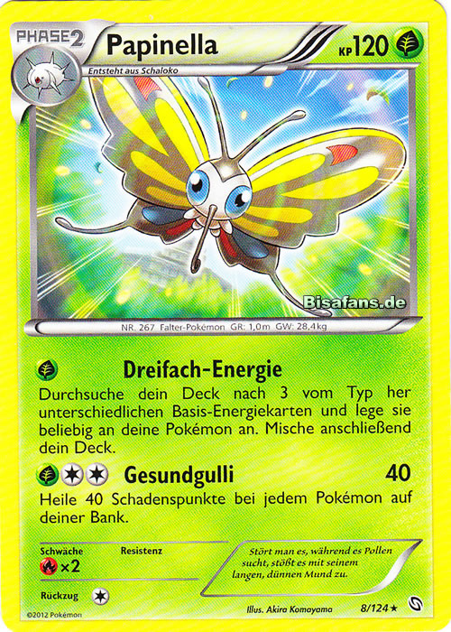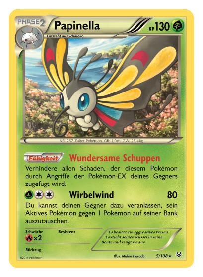 - OR Papinellas Lieblingsspeise ist Blütenstaub. Wenn du dieses Pokémon beobachten möchtest, musst du bloß einen Blumentopf vor ein geöffnetes Fenster stellen. Papinella wird sich diese Leckerei nicht entgehen lassen.