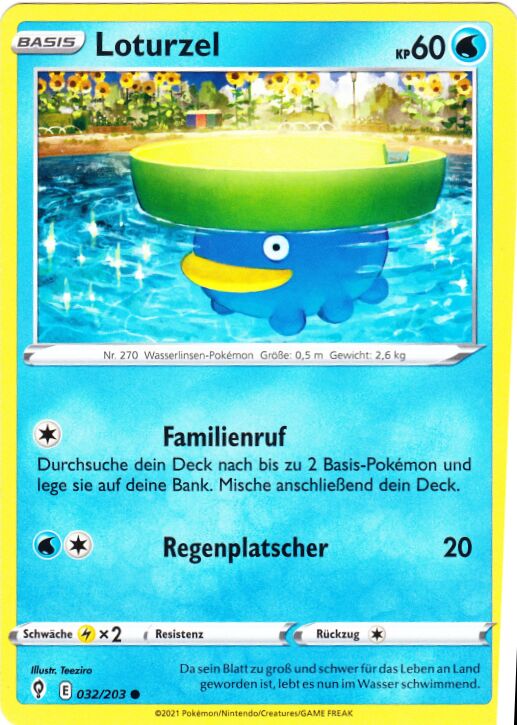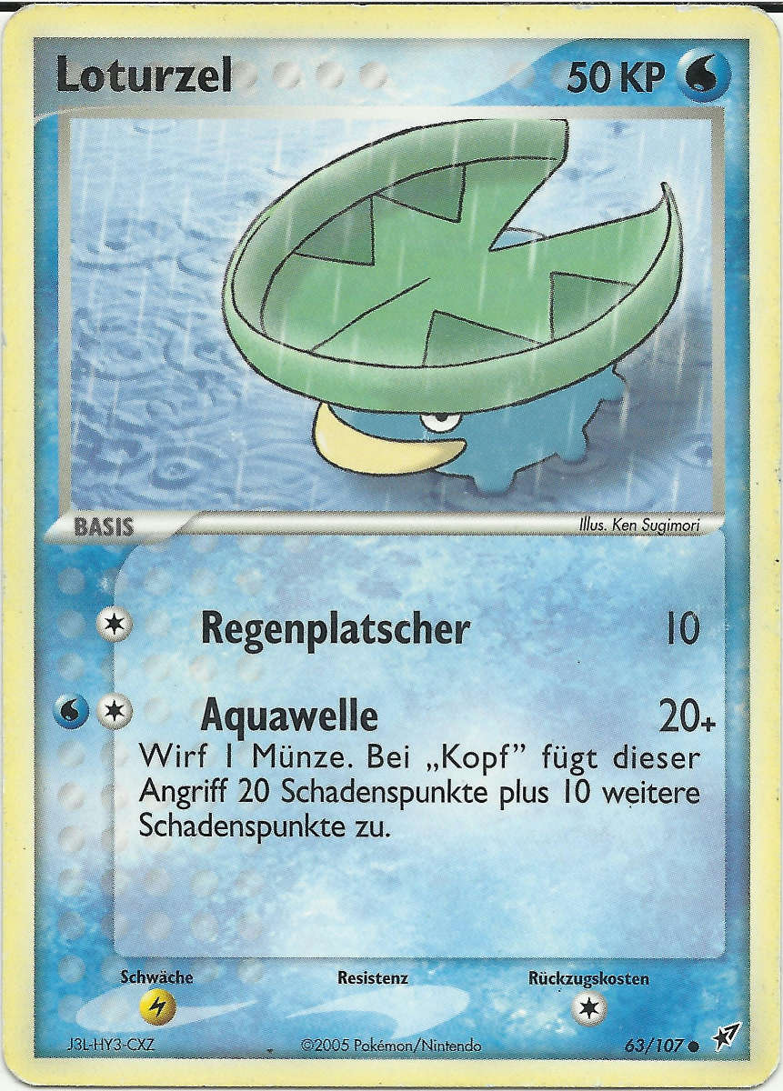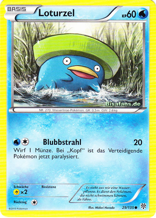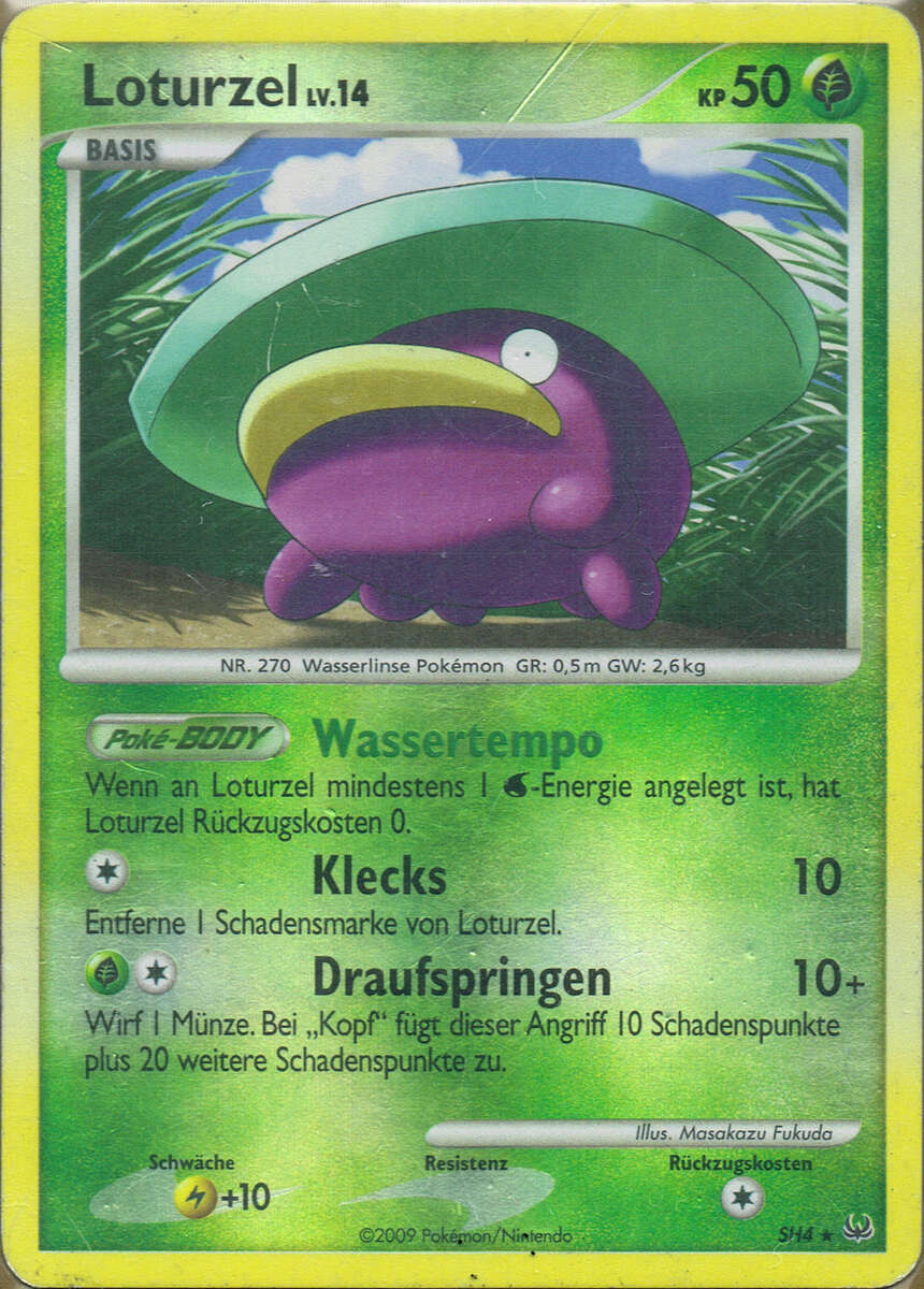- R LOTURZEL lebt auf der Wasseroberfläche von Teichen oder Seen. Es wird schwächer, wenn sein breites Blatt abstirbt. Nur selten geht dieses POKéMON an Land, um nach sauberem Wasser Ausschau zu halten.