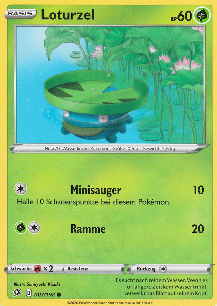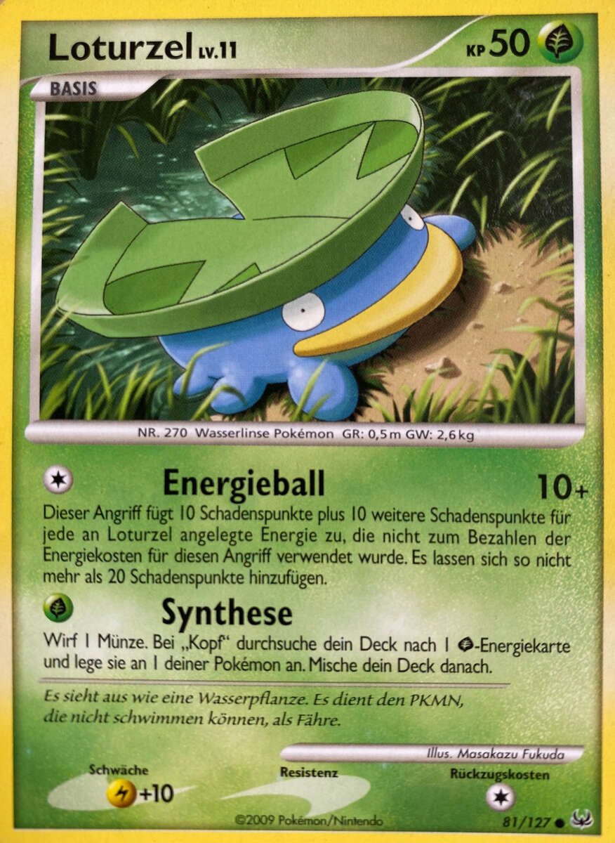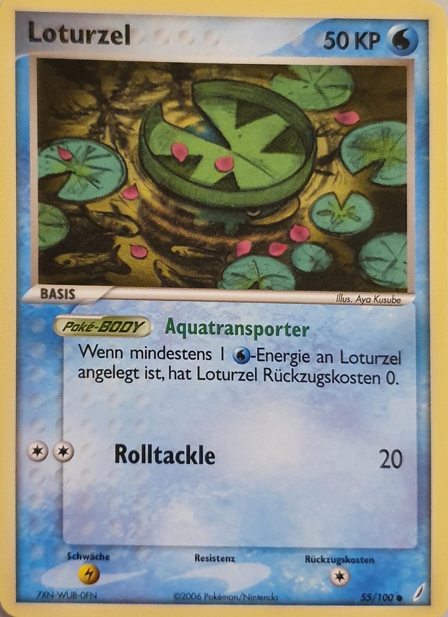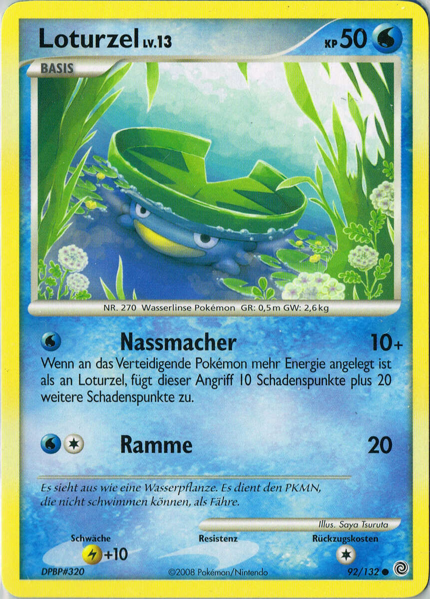 - OR Loturzel lebt auf der Wasseroberfläche von Teichen oder Seen. Es wird schwächer, wenn sein breites Blatt abstirbt. Nur selten geht dieses Pokémon an Land, um nach sauberem Wasser Ausschau zu halten.