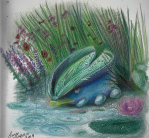 - S LOTURZEL soll einige Zeit an Land verbracht haben, aber ins Wasser zurückgekehrt sein, weil das Blatt auf seinem Kopf zu groß und zu schwer geworden ist. Nun lässt es sich auf dem Wasser treiben.