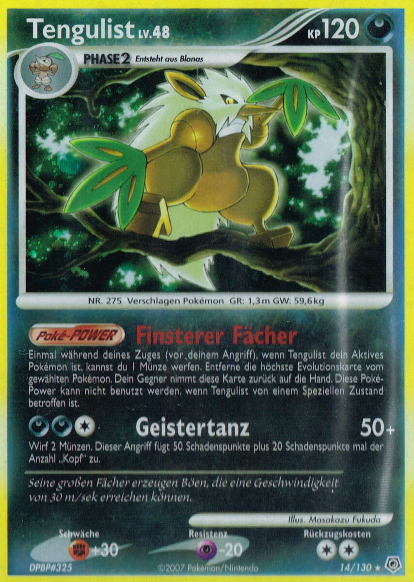 - S TENGULISTs große Fächer erzeugen Böen, die eine Geschwindigkeit von 30 m/sek erreichen können und alles und jeden hinwegfegen können. Dieses POKéMON lebt still und zurückgezogen in den Tiefen der Wälder.