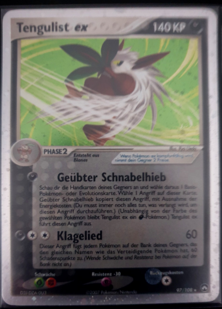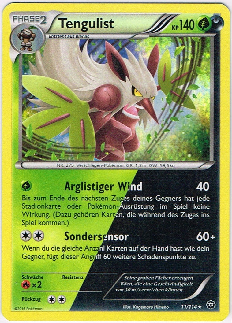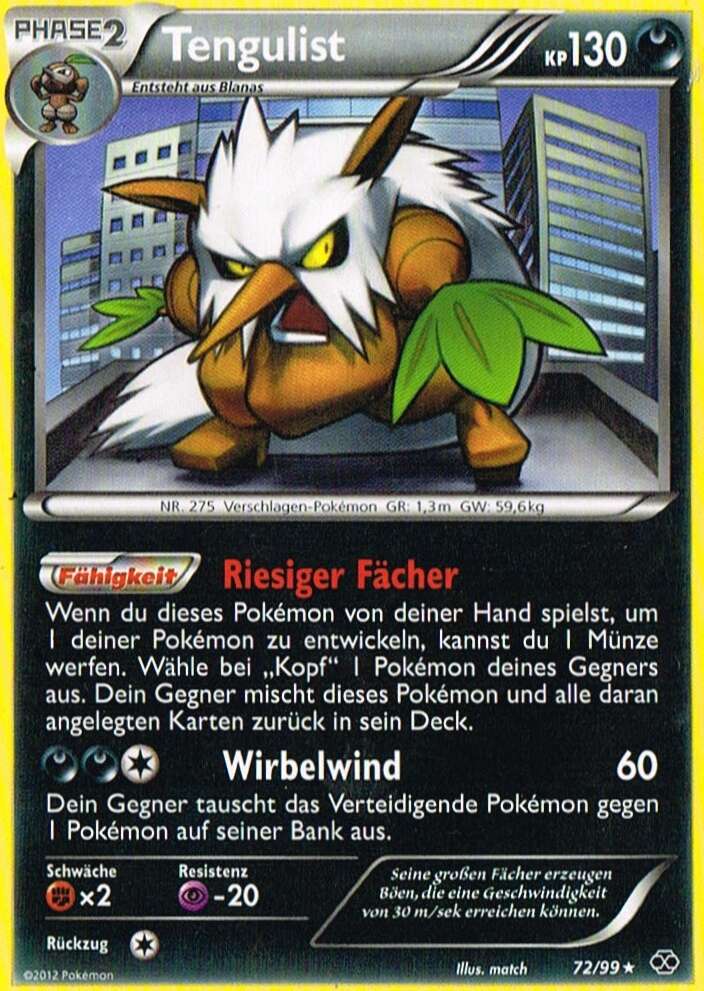 - AS Tengulists große Fächer erzeugen Böen, die eine Geschwindigkeit von 30 m/s erreichen können und alles und jeden hinwegfegen können. Dieses Pokémon lebt still und zurückgezogen in den Tiefen der Wälder.